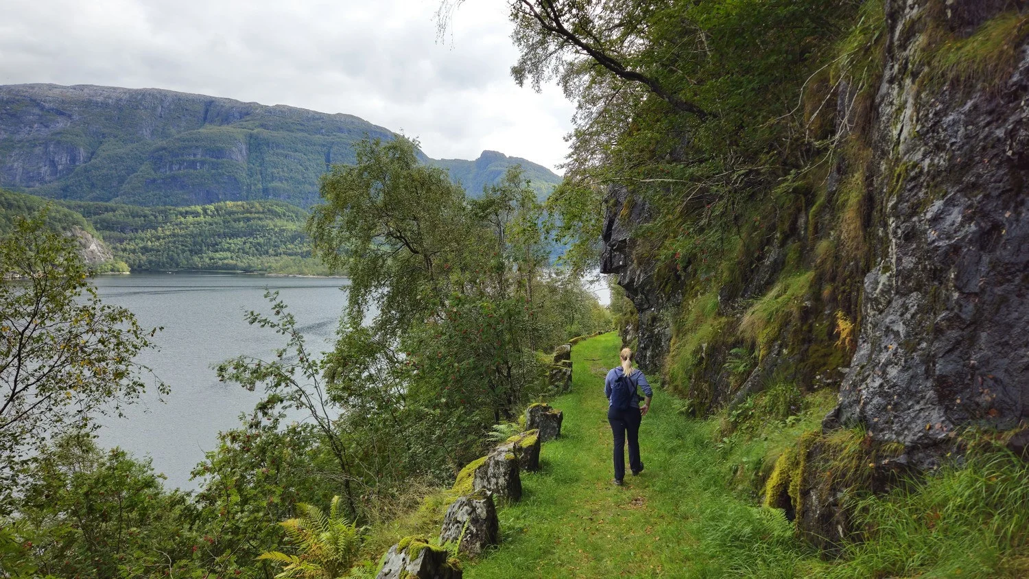 Turen går på grusvei og er lettgått, men samtidig dramatisk med bratte skråninger ned mot fjorden. Underveis får du både historiefølelse og god utsikt – en perfekt «nedtrapping» før du setter kursen tilbake mot Bergen.