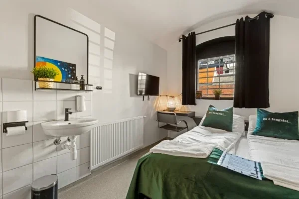 Her kan det overnattes i alt fra autentiske fengselsceller til familierom og suiter. Rommene er nyoppussede, med nye senger, strøm, TV og gratis internett, og cellene har toalett og liten vask. Gratis WiFi og parkering 24/7, felles dusjrom/WC, lademulighet for el-bil samt vask- og tørkemuligheter gjør oppholdet enkelt.