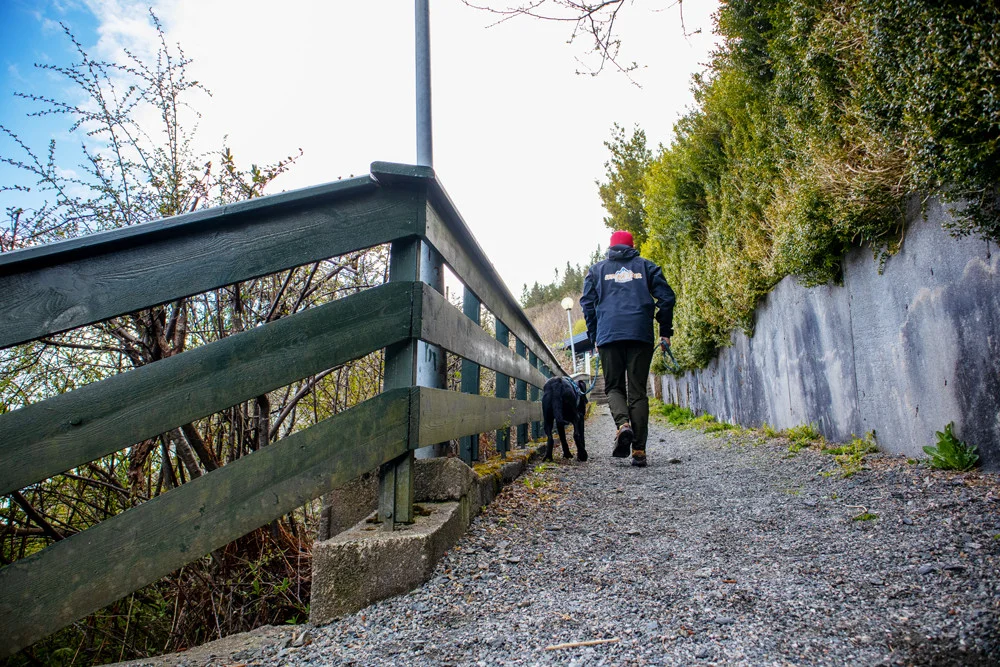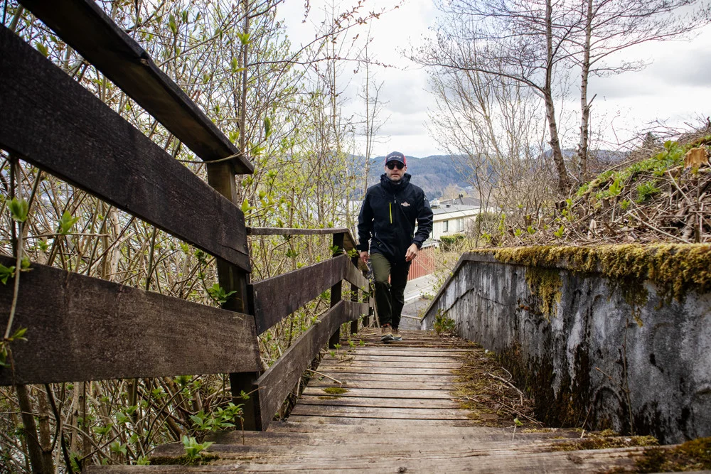 Like etter bakken ser du en tretrapp med grønt skilt merket "Smøråsen". Gå opp trappen og følg stien til du kommer opp igjen på Hatlestad terrasse. Følg veien ca. 200 meter til nytt skilt på venstre side.