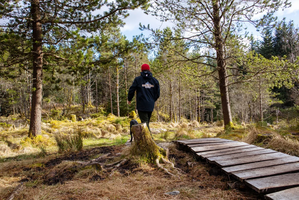 Gå inn her og opp tretrappen på høyre side. Det er skilt og merket. Gå stien gjennom granskogen til du kommer til en stor lysning.