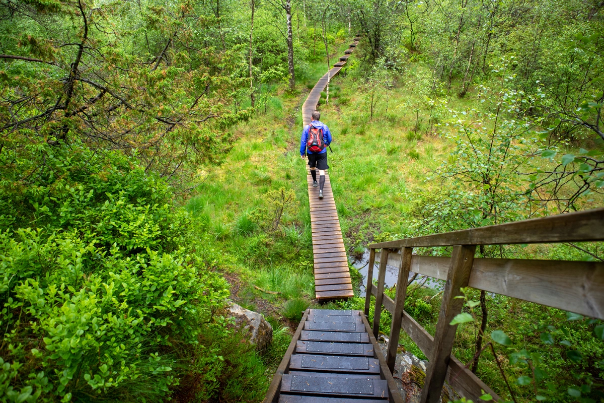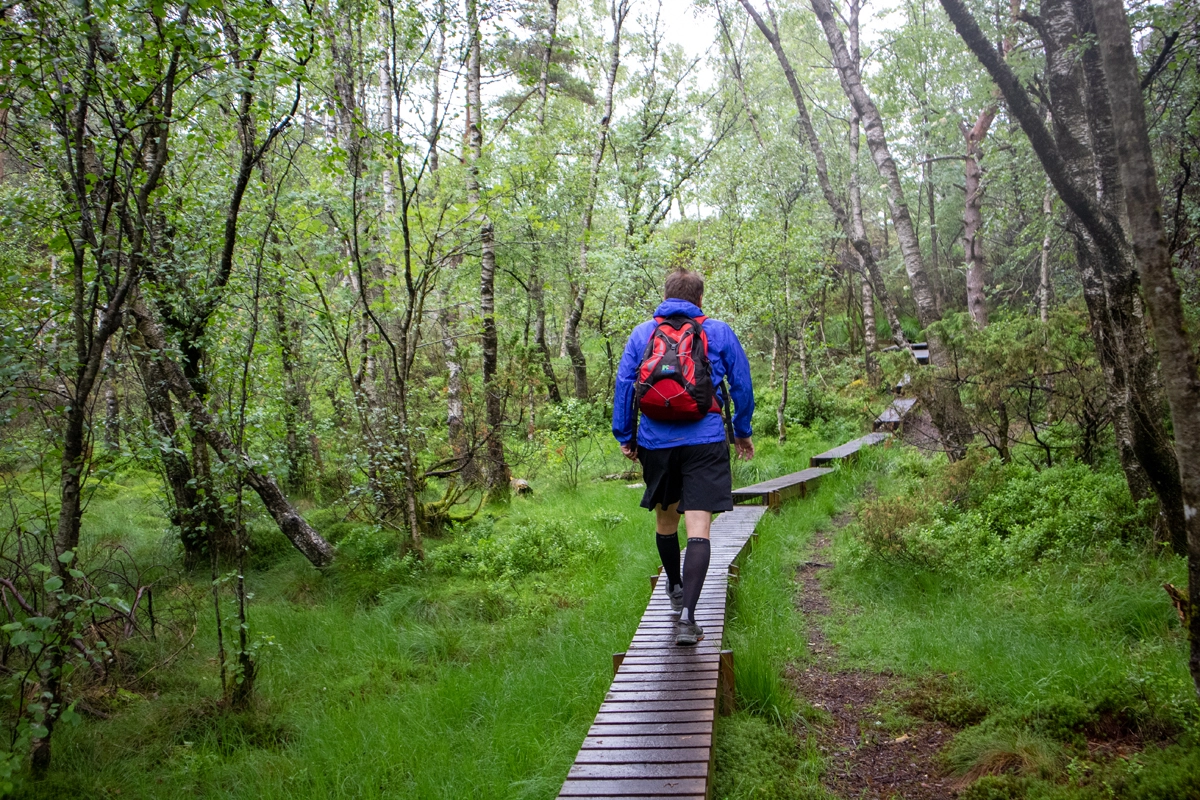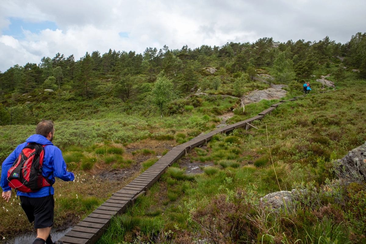 Når det flater ut har du vannet Langafjellstjørna på høyre side. Fortsett rett frem på stien over de uendelige lange trebroene. Siste stykket svinger stien mot venstre og det er jevn stigning mot varden.