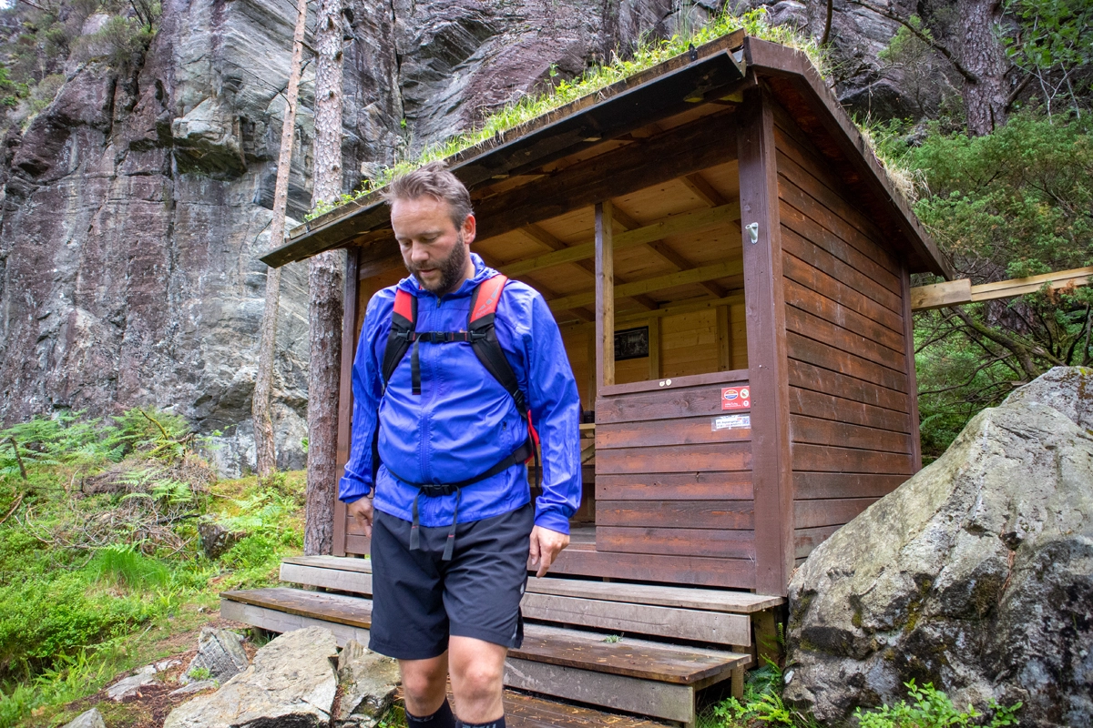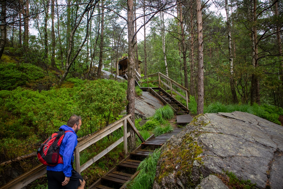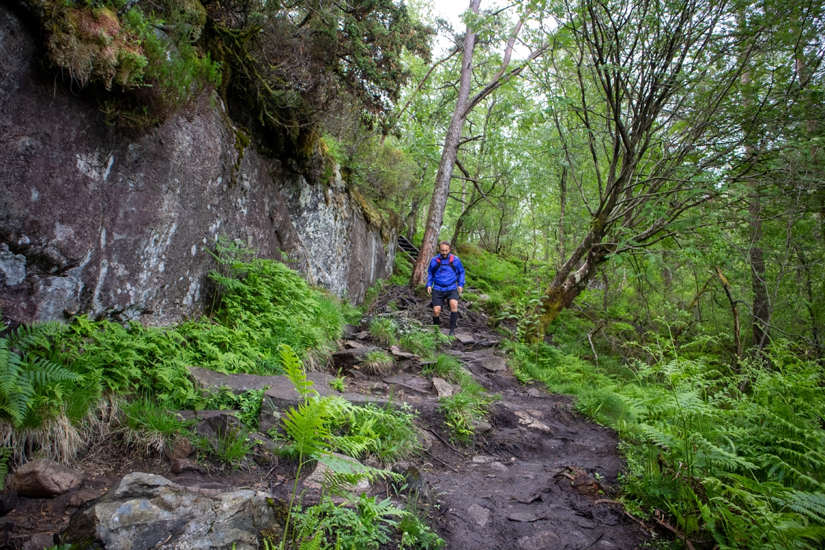 Turen er delt opp i etapper, men de sprekeste kan fint gjennomføre hele turen på en dag. Den 1. etappe starter i Kleppestø, men vi valgte (som vist på GPS-spor) å starte på Bergheim så vi kunne begynne rett på de flotte stiene.