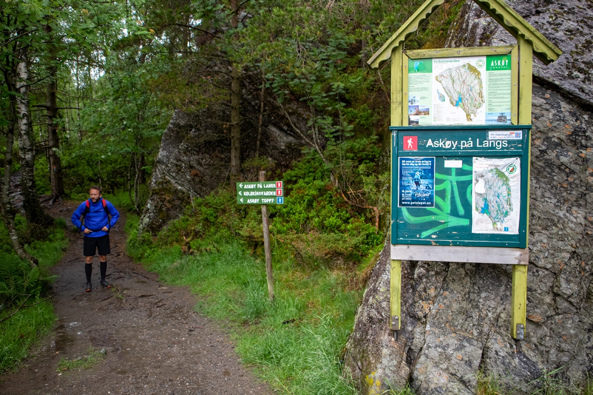 Fra Bergheim følger du stien hvor det er skiltet "Askøy på Langs". Gå stien innover i skogen og følg de flotte trebroene. Etter stykke går stien over en myr og nedover mot høyre. Følg denne stiene å gå ned trappene. Du kommer nå inn på hovedstien mot Kolbeinsvarden. Herfra er det jevn stigning. Gå opp trappene forbi Kvilebuen. Det er bare å følge stien mot nord.