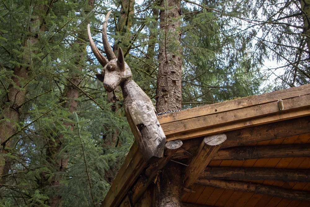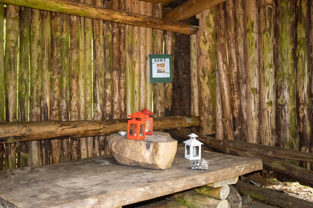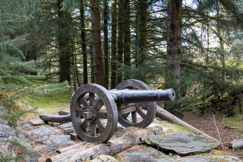 Her er en blekksprut skjært ut i tre, en stor gapahuk og en kanon. Det ligger skyttergrav fra krigen lengre nede.