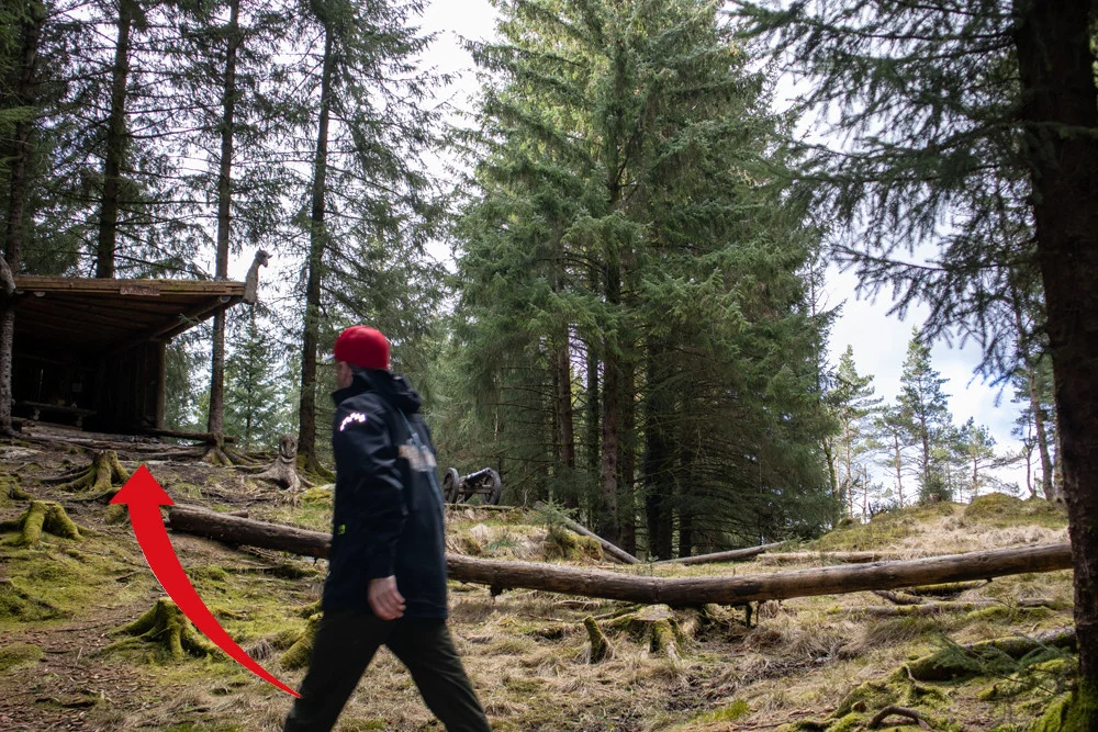 Gå inn her og opp tretrappen på høyre side. Det er skilt og merket. Gå stien gjennom granskogen til du kommer til en stor lysning.