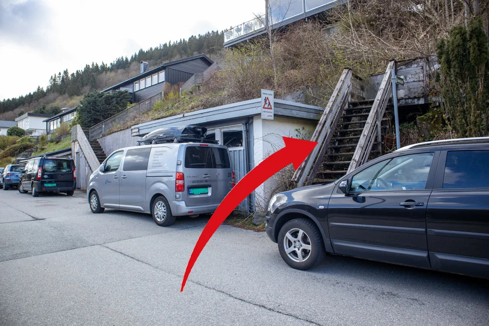 Gå opp trappen og følg stien til du kommer opp igjen på Hatlestad terrasse veien Følg veien ca. 200 meter til nytt skilt på venstre side.