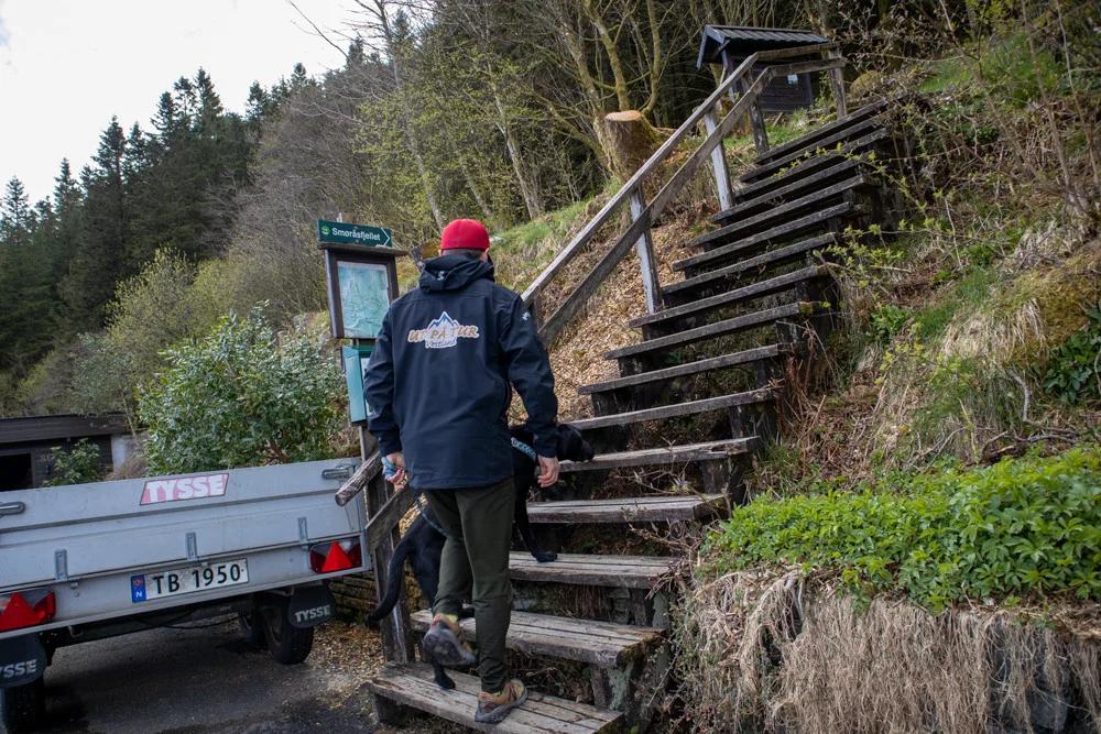 Turer starter ved Kiwi Valler. Gå bortover på Hatlestad terrasse. Like etter bakken ser du en tretrapp med grønt skilt merket "Smøråsen".