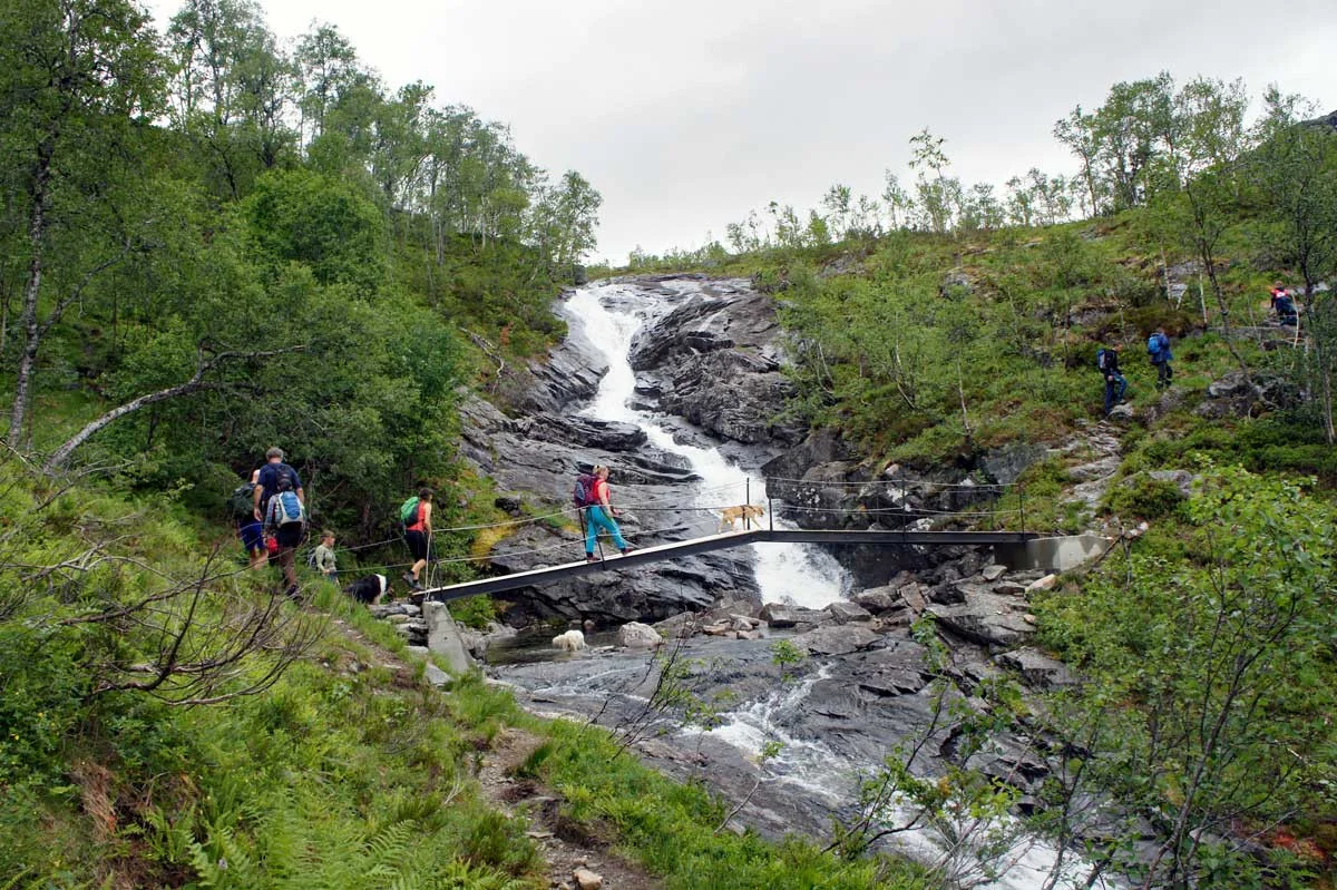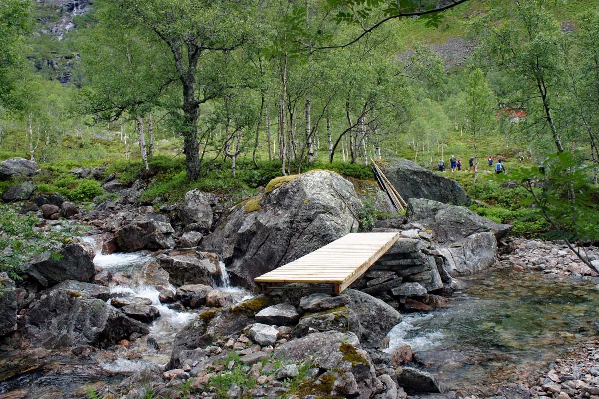 Spenn på skiene og følg anleggsveien ca. 300 meter innover i dalen. Like ved broen...