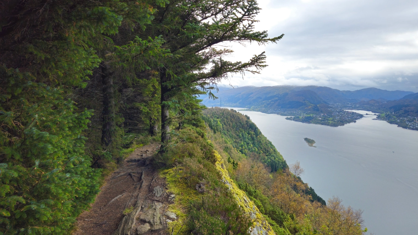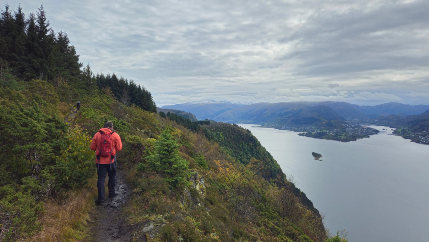 Turen fortsetter videre sørøstover langs ryggen. Her går stien helt ute på kanten og byr samtidig på panoramautsikt, spesielt flott inn mot Arna.
