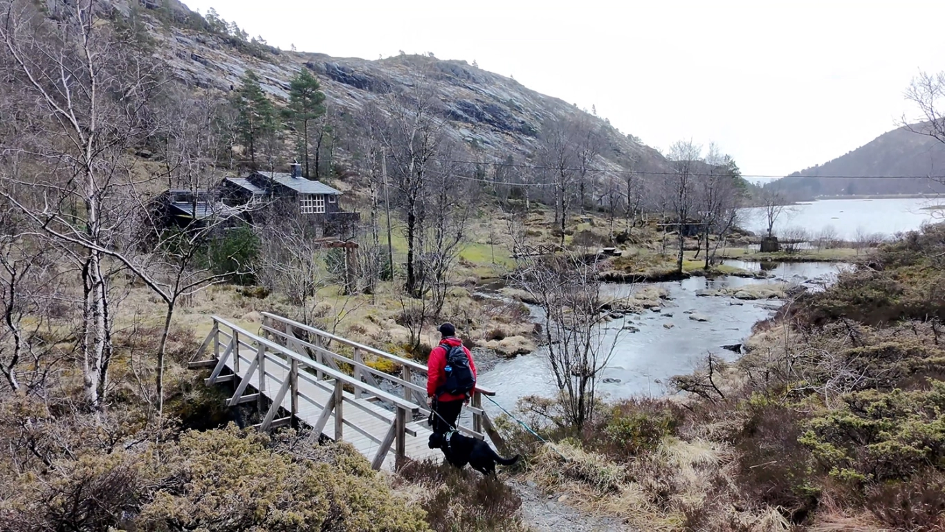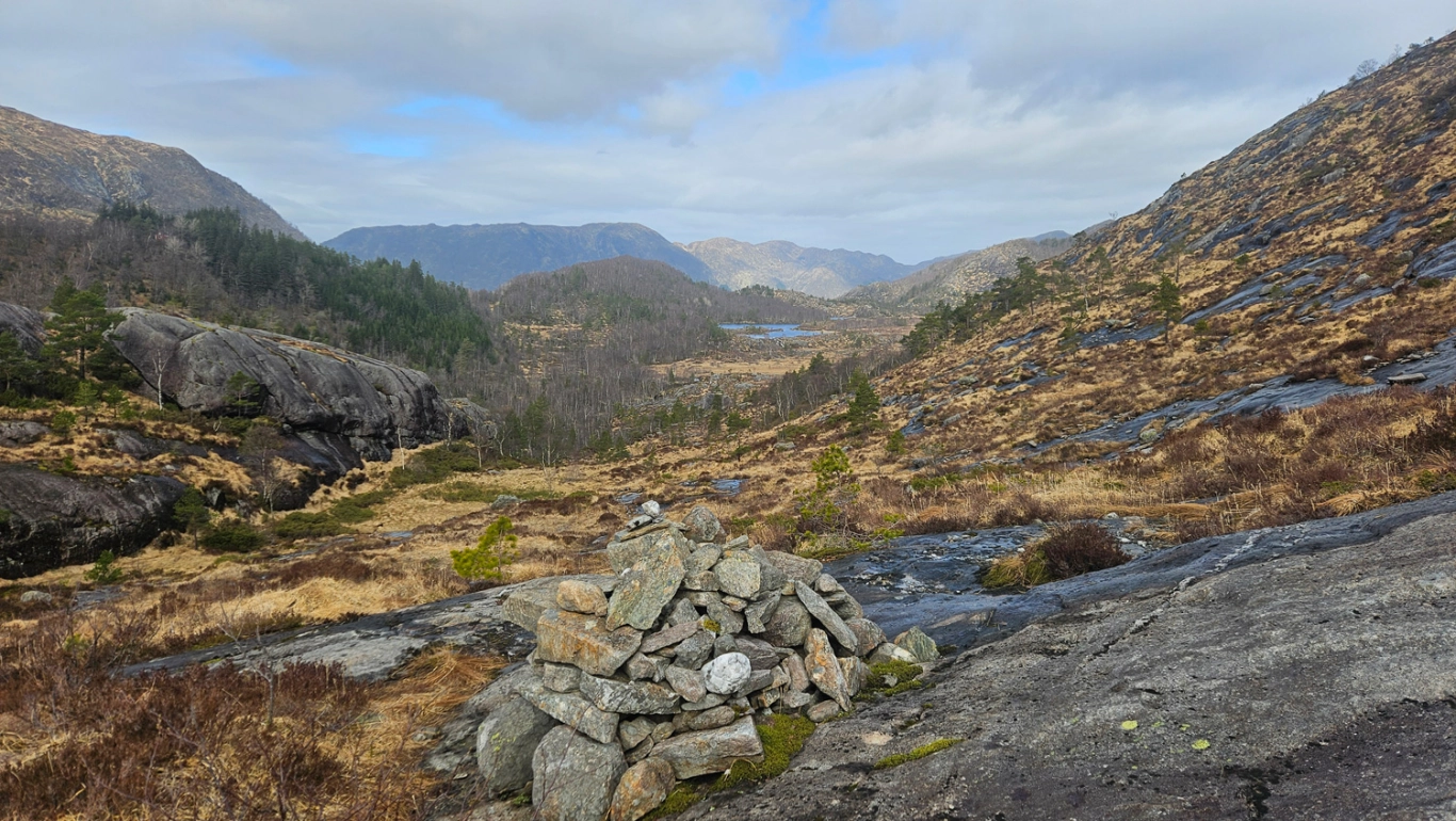 Ved elvemunningen som renner ut i vannet, krysser du en bro og fortsetter nordover gjennom hyttetunet. Gå forbi den siste hytten, og følg stien som runder rundt på baksiden og videre opp i skaret bak vannet. Her går stien et stykke langs en fjellvegg. Kort etter får du øye på en steinvarde på venstre hånd – ta av ved denne og følg stien som leder opp til det første platået, kalt "Skåpet".