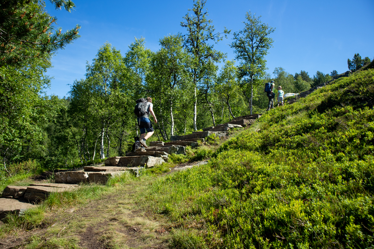 Her fra svinger stien mot venstre og du må opp et bratt parti og videre på nye sherpatrapper. Nå følger en lang oppstigning langs ryggen før en flatere stigning mot toppvarden.