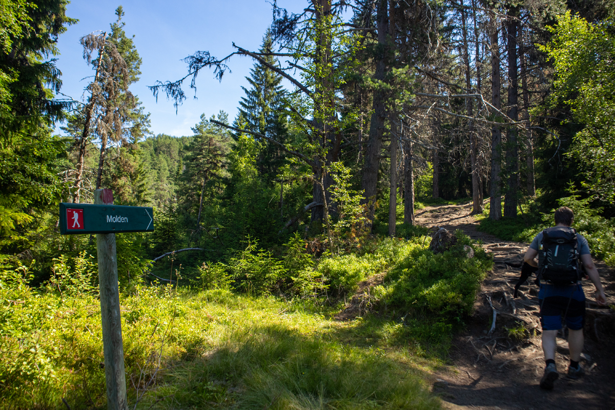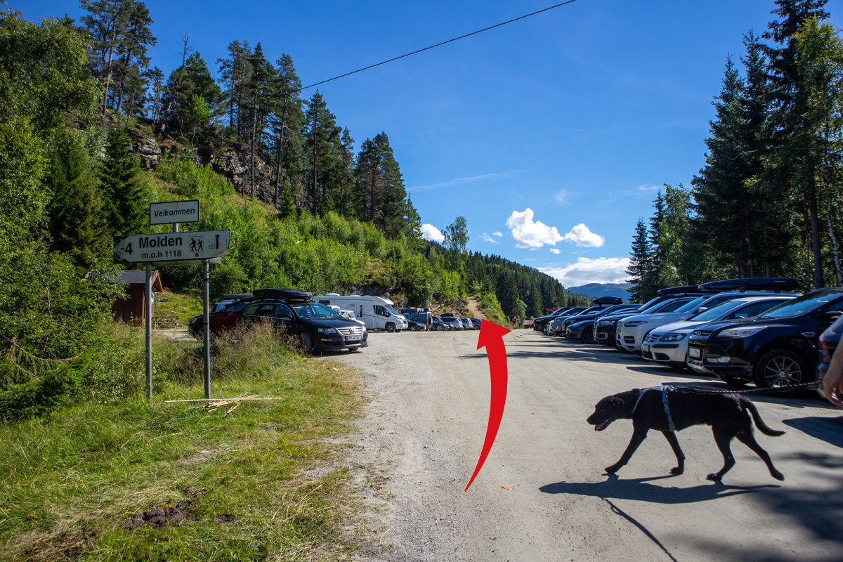 Gå til enden av første parkeringsplass og inn på skogsvegen til venstre opp bakken og videre på sti. Det er mange som går her så stien en ekstremt bred. Etter et stykke kommer du inn på ny skogsvei / grusvei. Følg denne til nytt skilt merket "Molden". Nå går det over på sti. Det lange lange trebroer og sherpatrapper. Følg stien til over tregrensen hvor du begynner å få fjordutsikt.