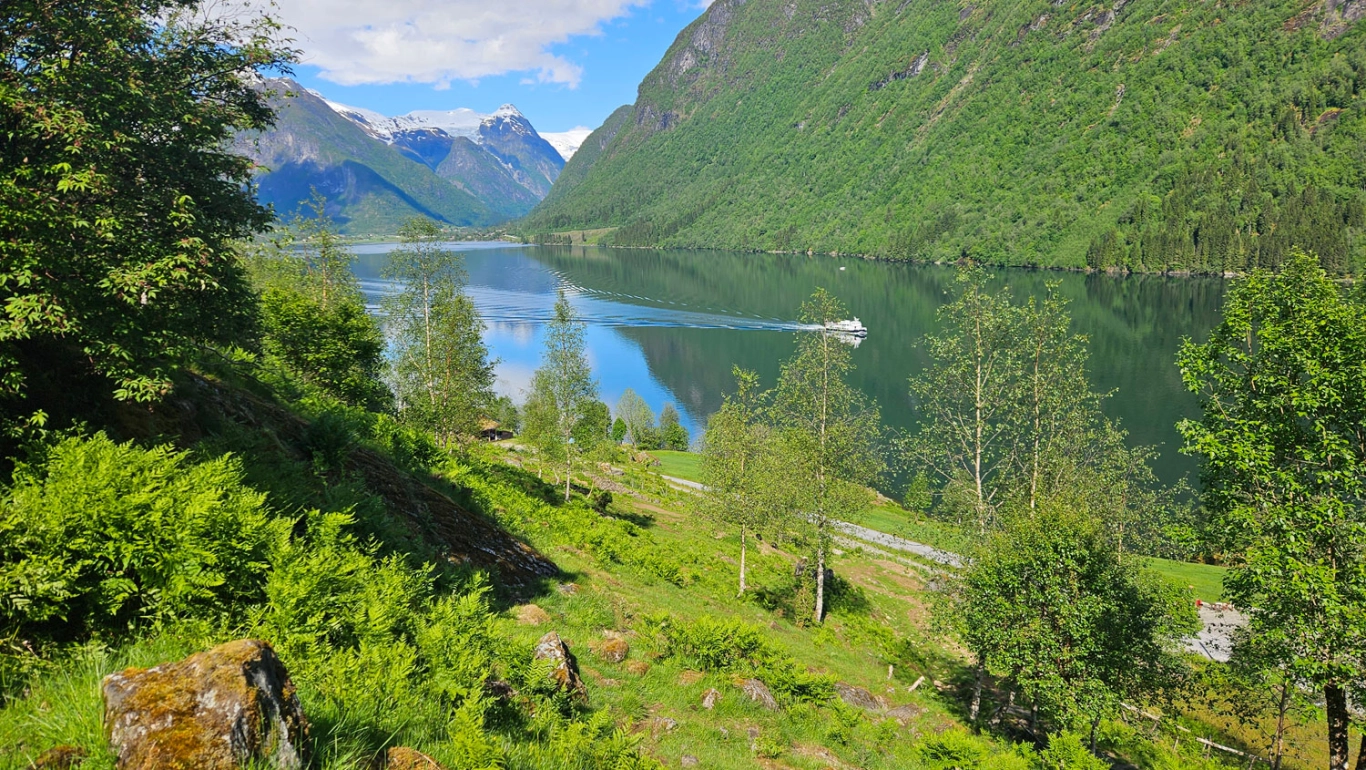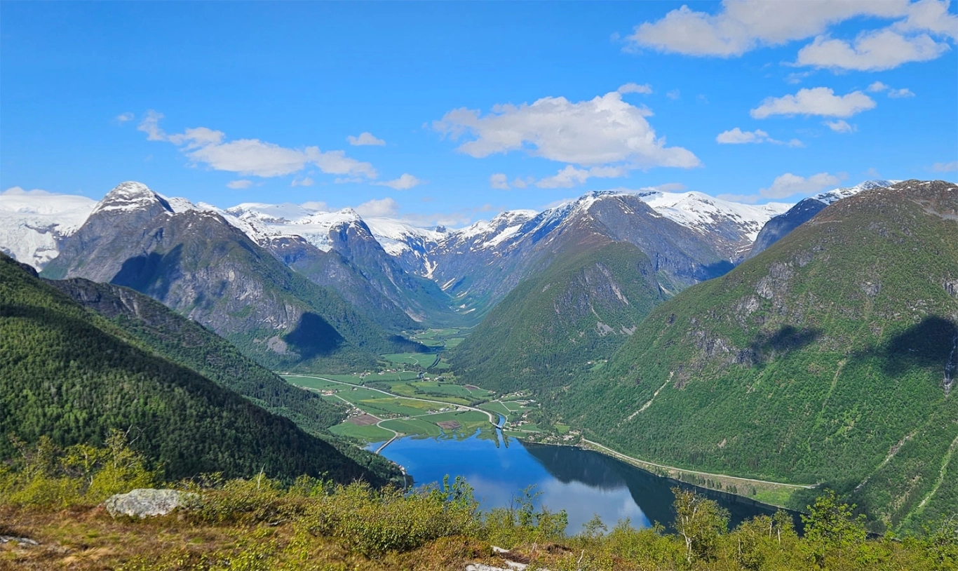Toppen byr på flott utsikt innover mot Fjærland, og du ser også Jostedalsbreen og noen av brearmene.