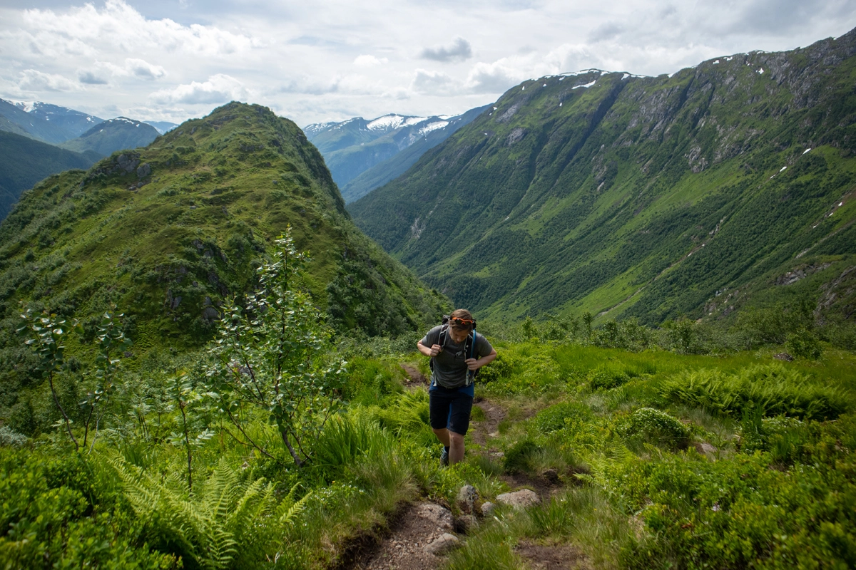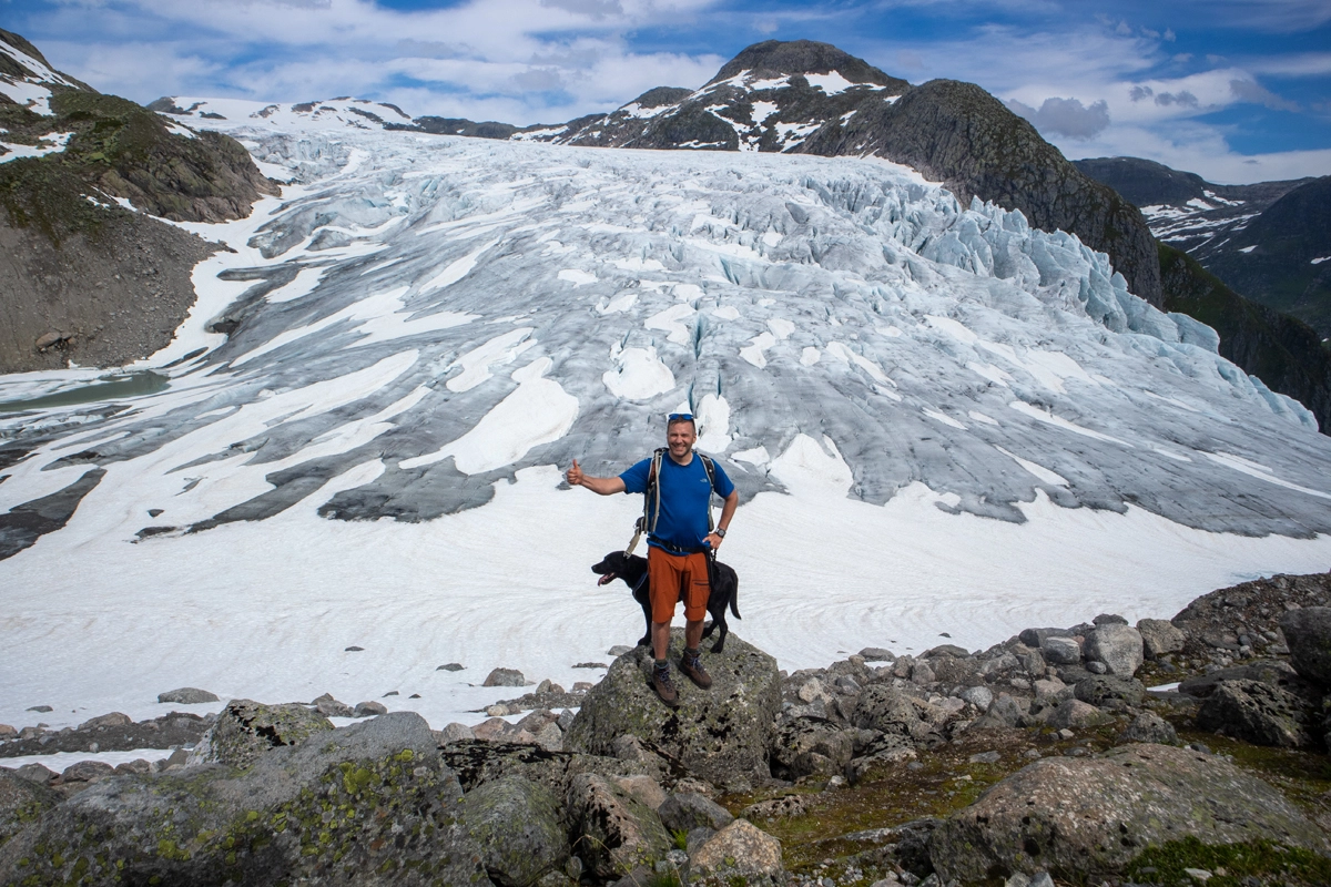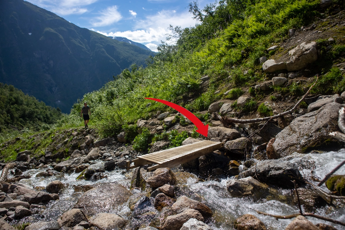 Den mest brukte "vanlige" stien opp til breen og hytten er til venstre, men for den ultimate opplevelsen anbefaler vi å gå til høyre.
