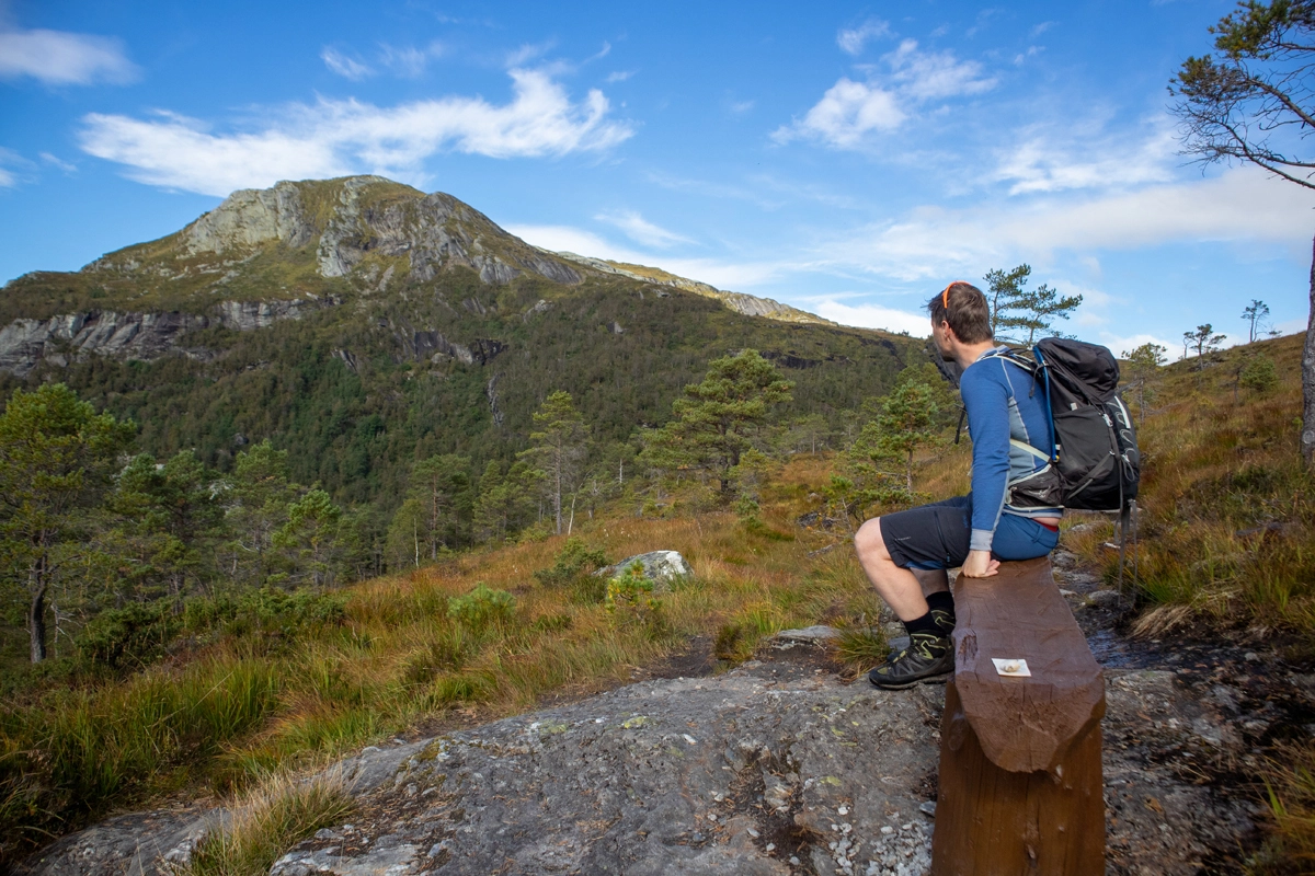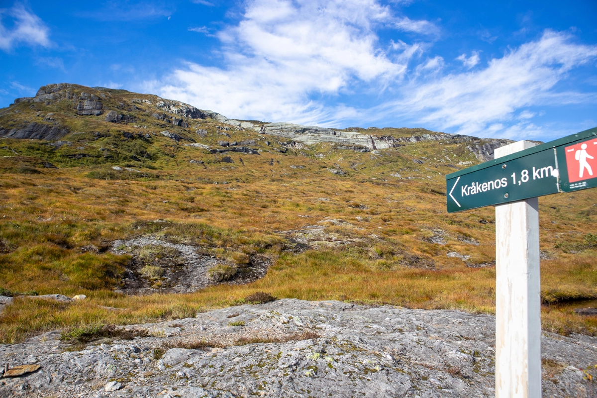 Gå til venstre i krysset og du får fint utsikt mot Kråkenos. Like over tregrensen er en benk hvor du kan ta en pause. Følgt deretter T-merket sti opp mot fjellet. I ryggen har du fin fjordutsikt. Ved nest stikryss skilt "Kråkenos 1,8 km" skal du gå til venstre.