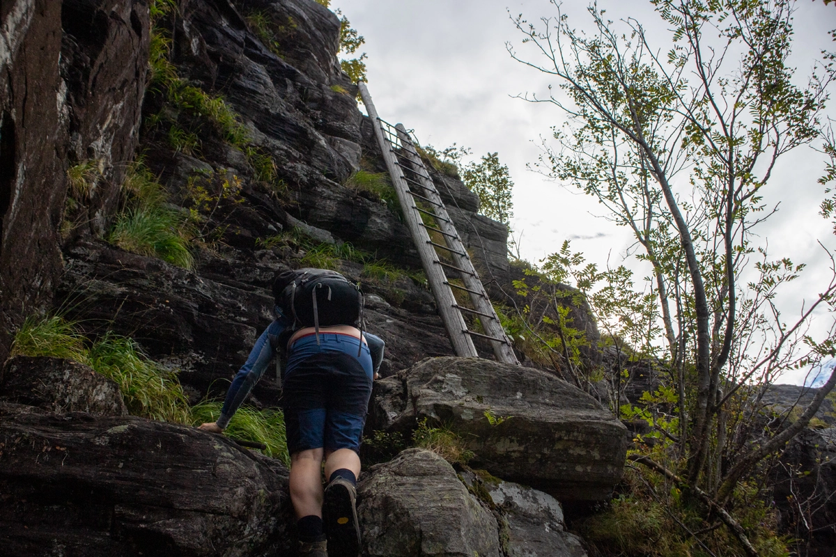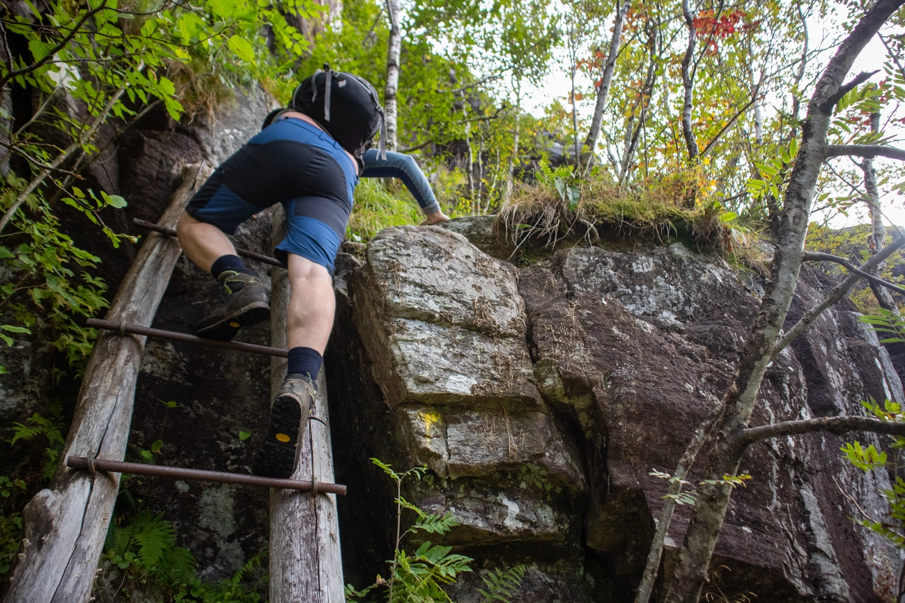 Stien klatrer på kryss og tvers opp fjellsiden mot stigene. Det er 2 stk. av dem. Først en kort stige og deretter en lang. Veldig spesiell opplevelse.