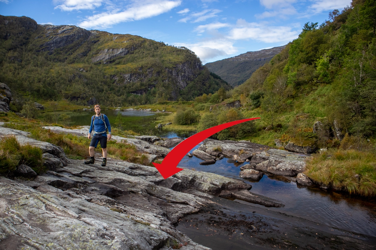 Gå i hjørnet av innmarken mot skogsveien som begynner like oppe i skråningen. Den går først mot venstre og så svinger den til høyre og følger høyspentmasten. Etter stykke flater det ut og du går på fin sti innover på venstre side av elven. Etter 1 km. kommer du til stikryss hvor du kan velge å gå via stigen eller gå rundt. Vi valgte stigen. Denne veien er bratt og passer i for de med høydeskrekk. Om du går rundt er det ca. 1 km lengre.