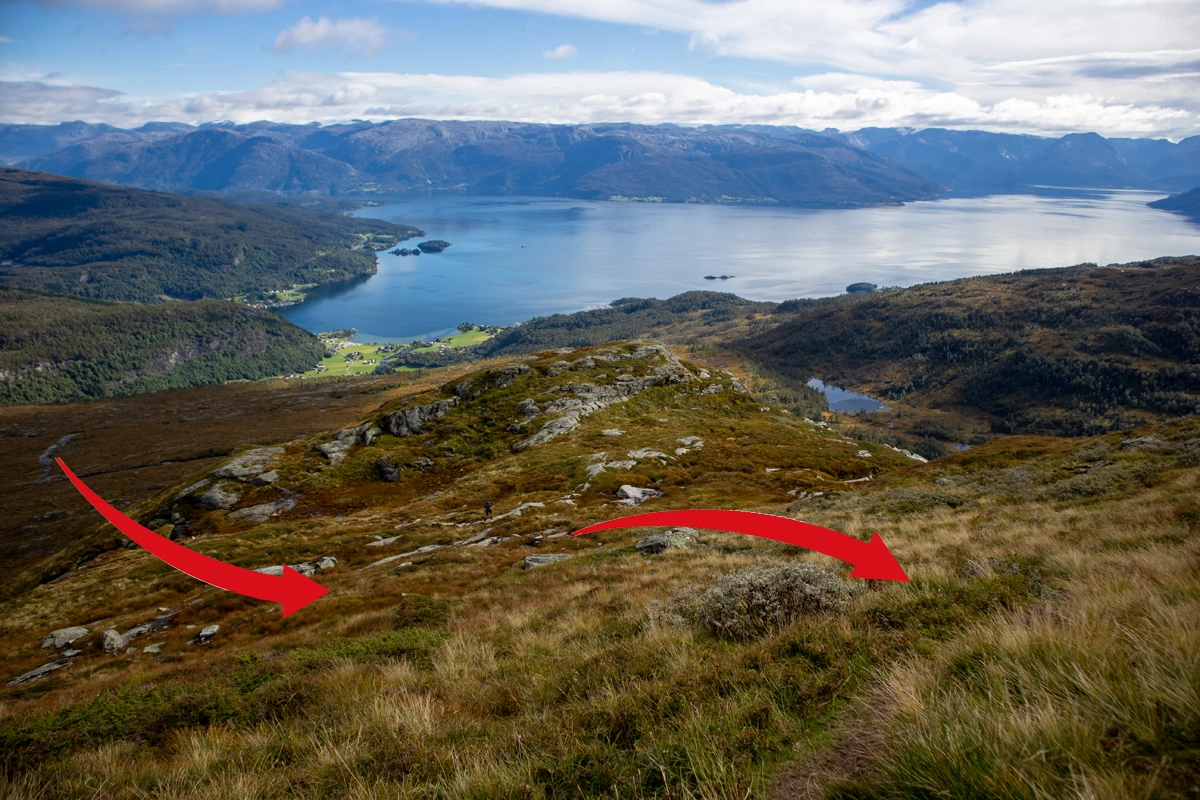 Nå starter den tøffeste delen av turen, for her er det bratt. Det er egentlig bare og følge stien som svinger seg opp fjellsiden til toppen. Når du er oppe på ryggen gå du til venstre mot varden.
