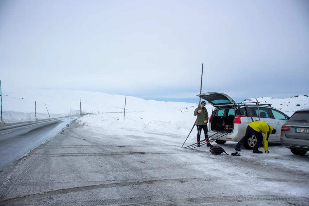 Spenn på skiene ved parkeringen å gå innover i Krossdalen retning nord.
