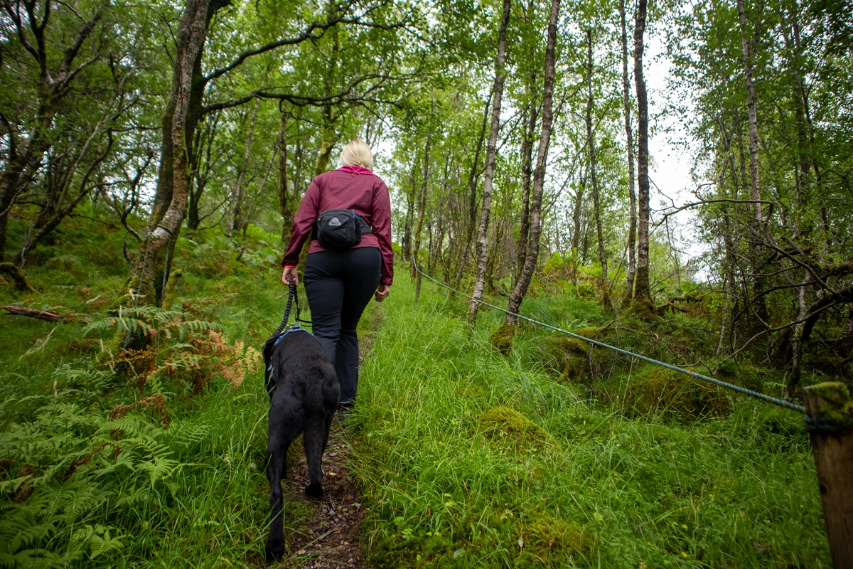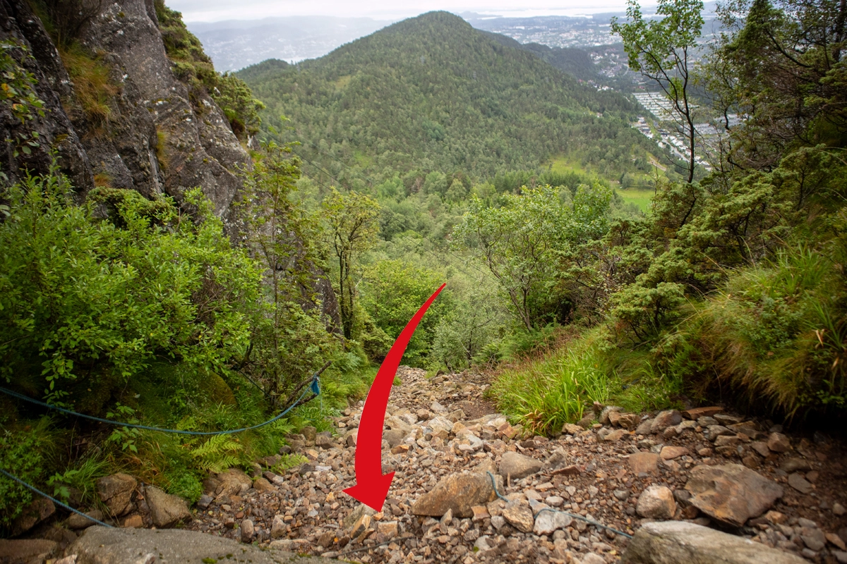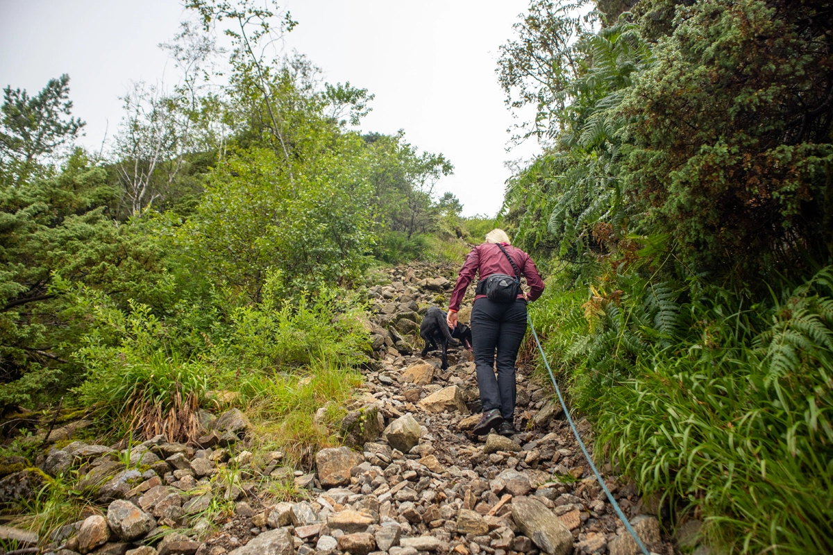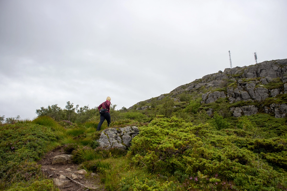 Det er steinene og en del glatte røtter, men stien er tydelig og lett og følge. På ca. 325 moh. må du opp en bratt steinrøys. Gå forsiktig her. Et stykke lengre opp er det lagt ut tau. Like ovenfor steinrøysen flater terrenget ut og utsikten blir god. Følg siste del av stien som går på kryss og tvers opp til Løvstakken varden.