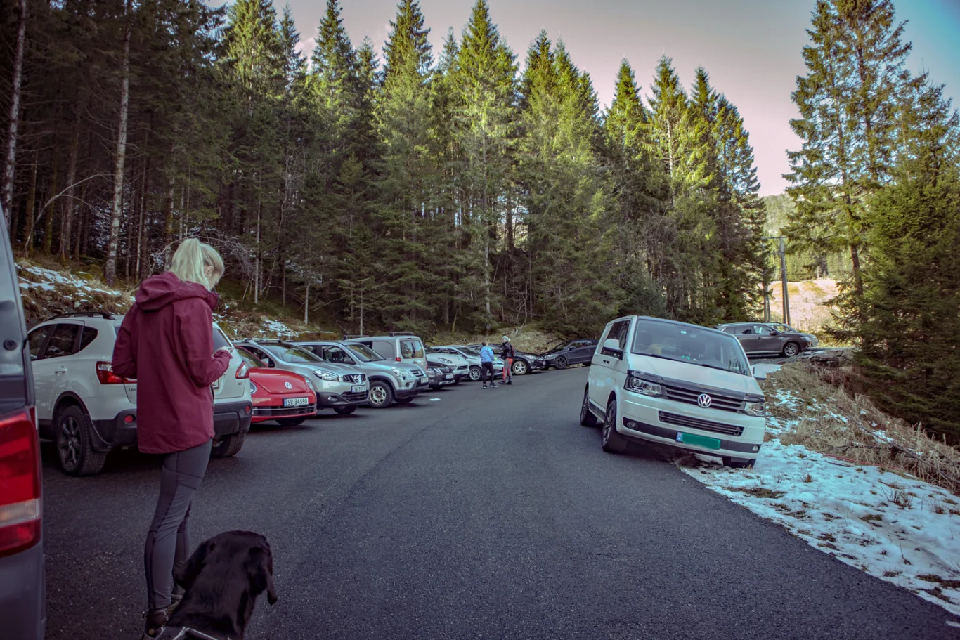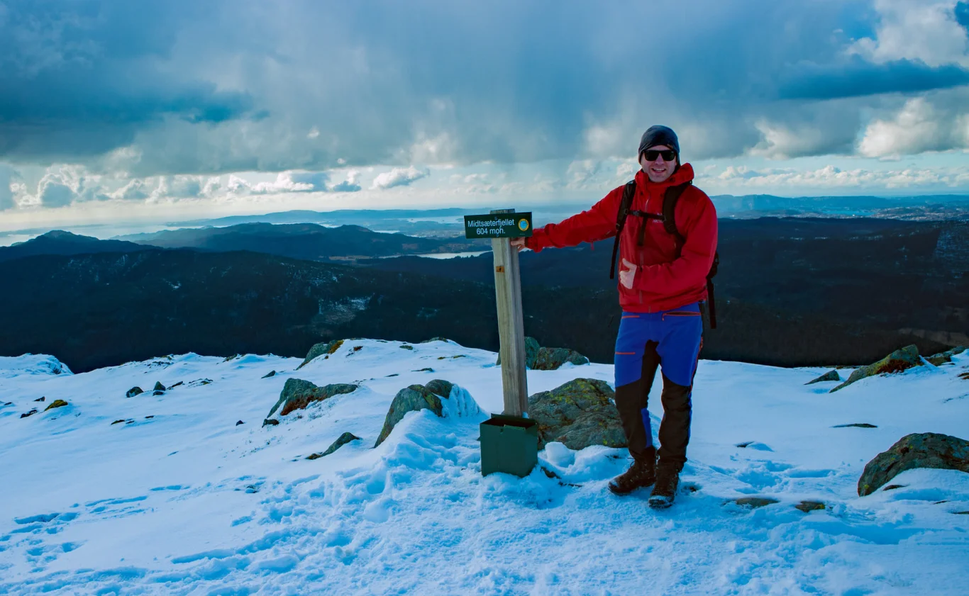 På toppen er det ingen varde, men et skilt, postkasse og bok.