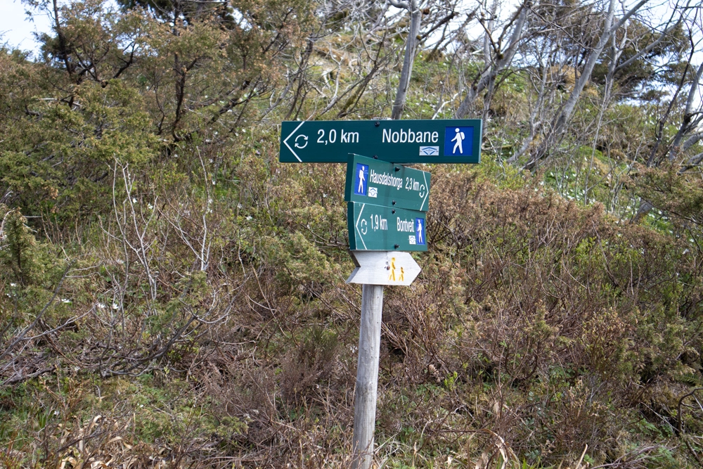 I stikrysset like etter elven, skal du gå til venstre skiltet "Noabbane". Følg sten til toppen.