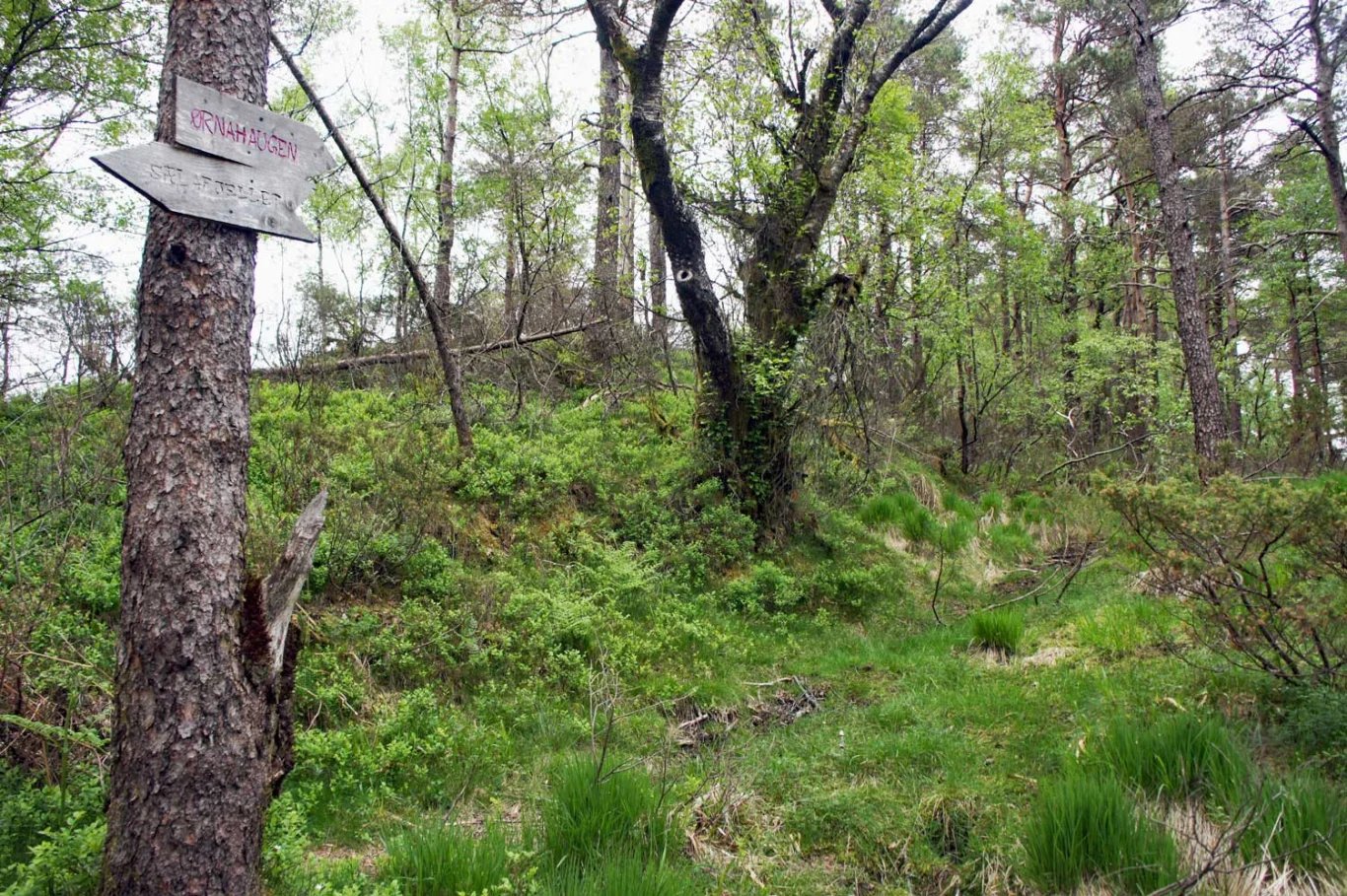 Følg grusveien forbi bommen. Det er skiltet mot Raudslistova. Etter noen hundre meter vil du se en sti (venstre side) som går oppover lien. Det henger et gammelt skilt på et tre merket "Ørnhaugen".
