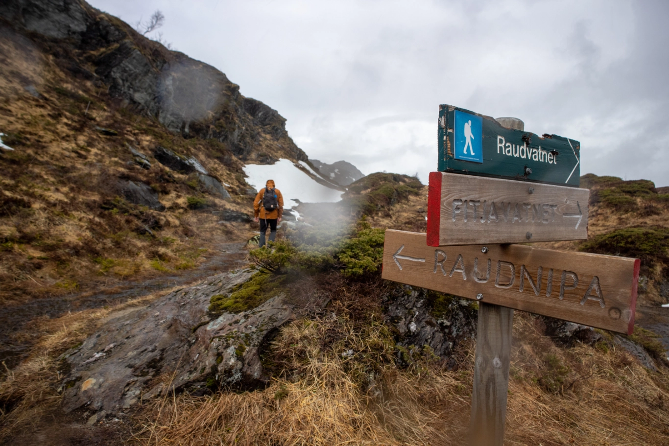 Like før vannet kommer du til stikryss med skilt merket "Raudnipa". Her skal du følge stien til venstre rundt Raudvatnet. Herfra blir stien mer utydelig men det er godt merket med rødmerkede steinvarder. Gå nordover på venstre side av vannet. Ved enden av vannet kommer nytt skilt merket "Raudnipa". Nå starter en noe bratt oppstigning til toppen av fjellet. Følg merket sti helt til topps. Pass på for glatte partier da det renner mye vann langs stien.