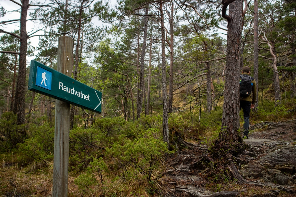 Fra Bir Samnanger må du krysse hovedveien. Pass på for bilene kommer i stor fart. På andre siden av veien er det skilt merket "Raudvatnet". Det er her vi skal gå til først. Følg traktorveien som snegler seg opp over ryggen. I veikrysset skal du følge skilting til venstre, og like etter går turen over på sti. Du vil legge merket til at det er mange skilt med "Raudvatnet" langs hele traseen. Følg stien forbi utsiktspunktet med benken og videre forbi 2 stk. hytter. Kryss trebroen over bekken og følg sti som leder opp langs bekken. Det er ca. 3,5 km. fra start opp til Raudvatnet.