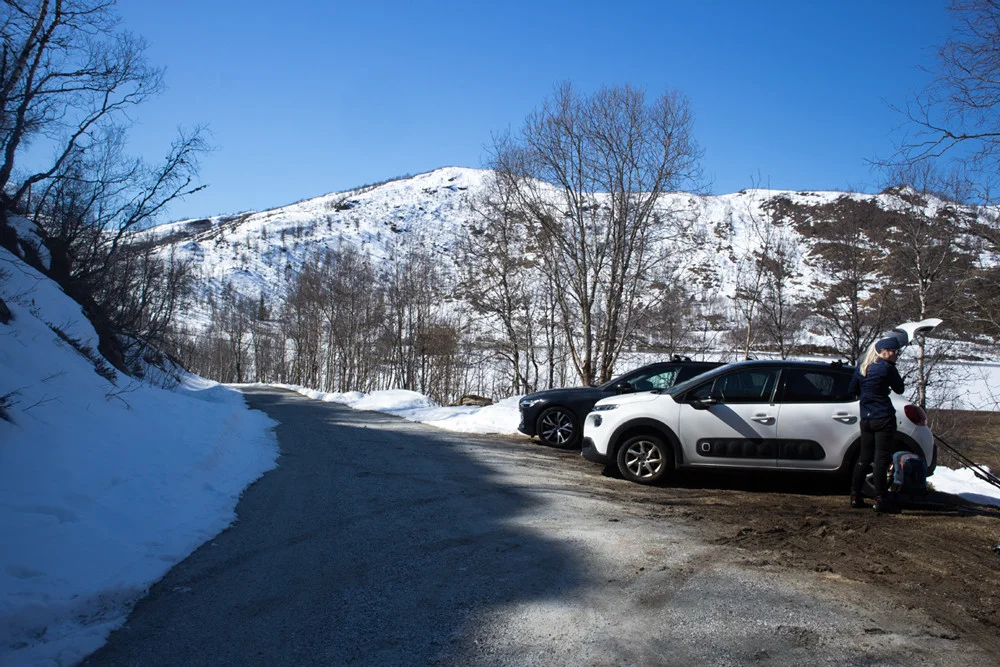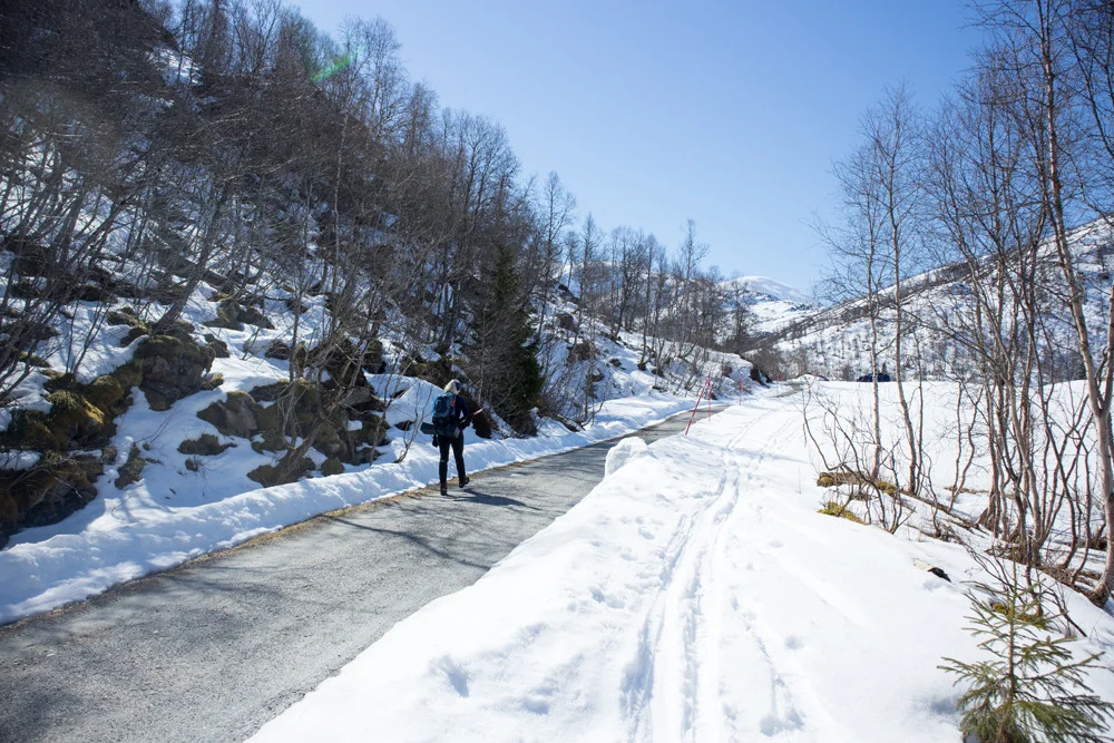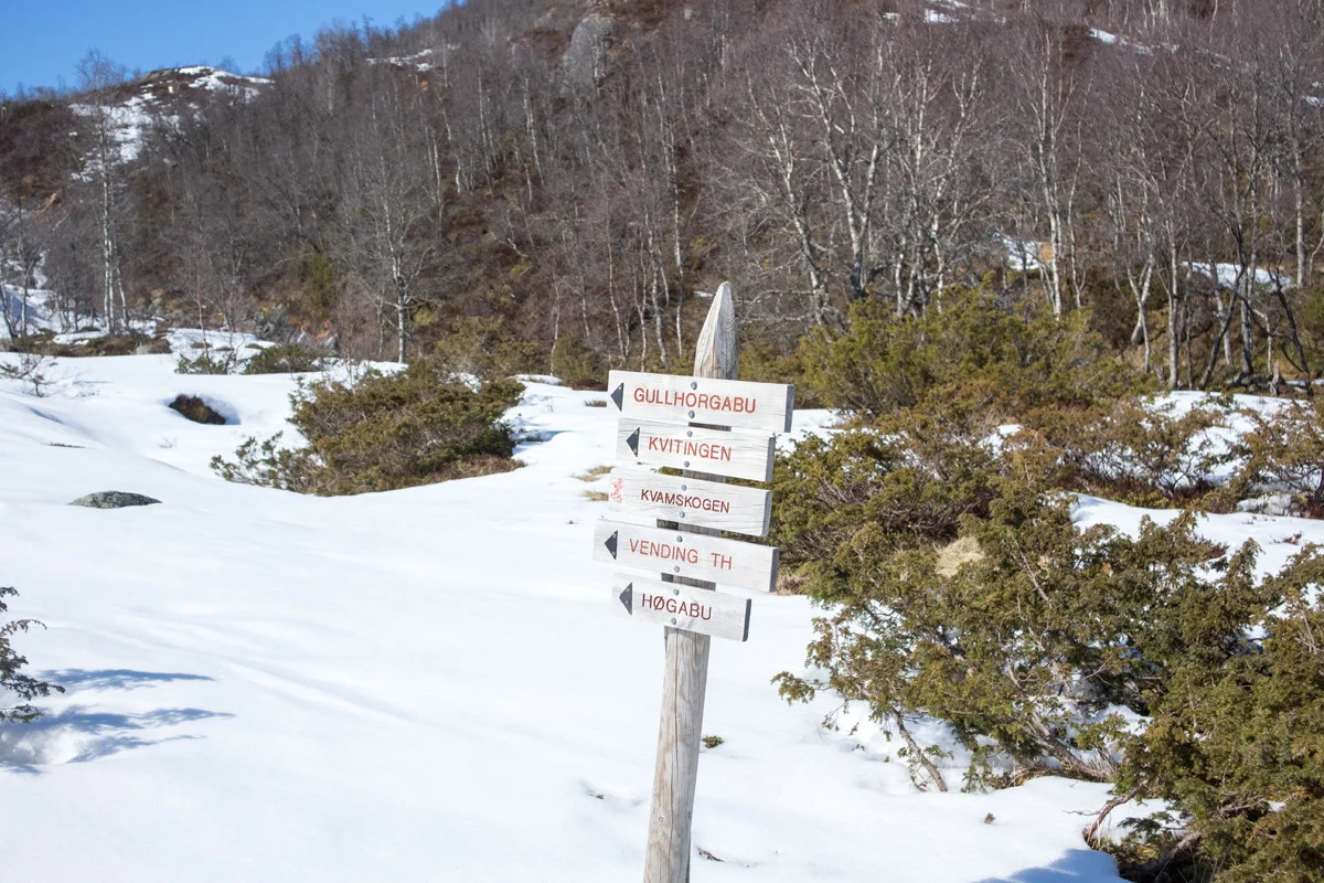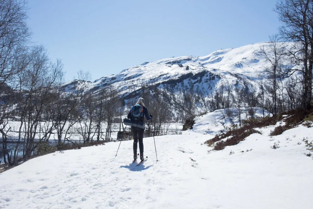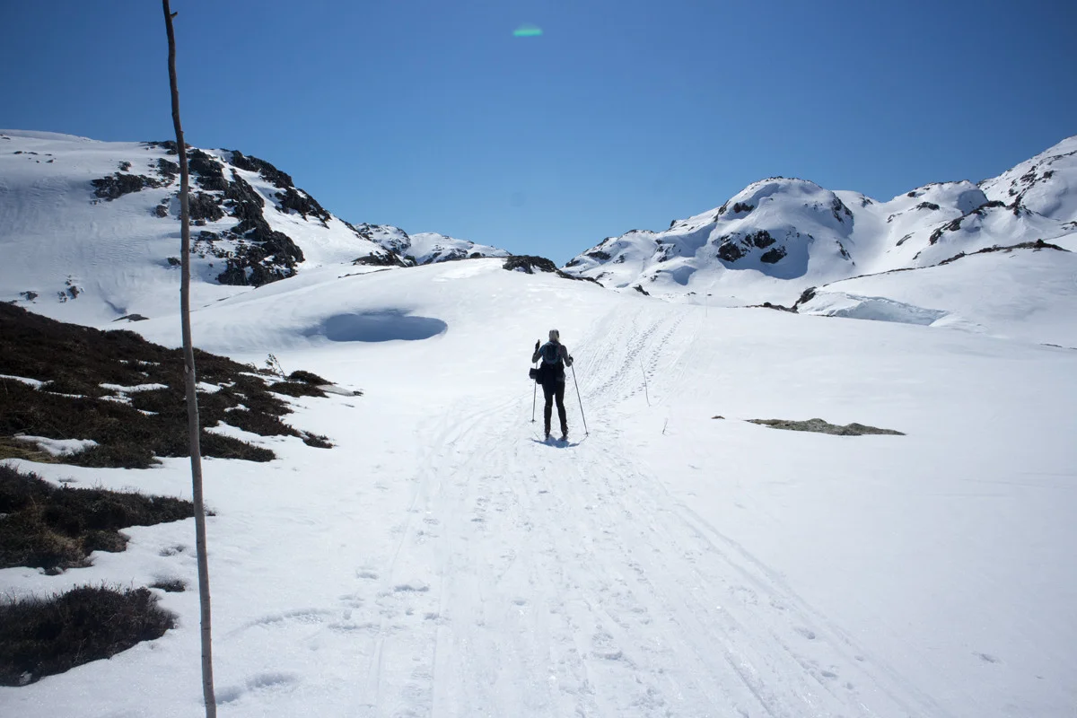Følg kvistet løype videre innover dalen og kryss noen vann. Holdt til høyre før nedrenning til Storlitjørni vannet. Om isen ikke er trygg anbefales å holde til høyre. Sommerstien går på venstre side men her er det bratt og mer utsatt for ras.