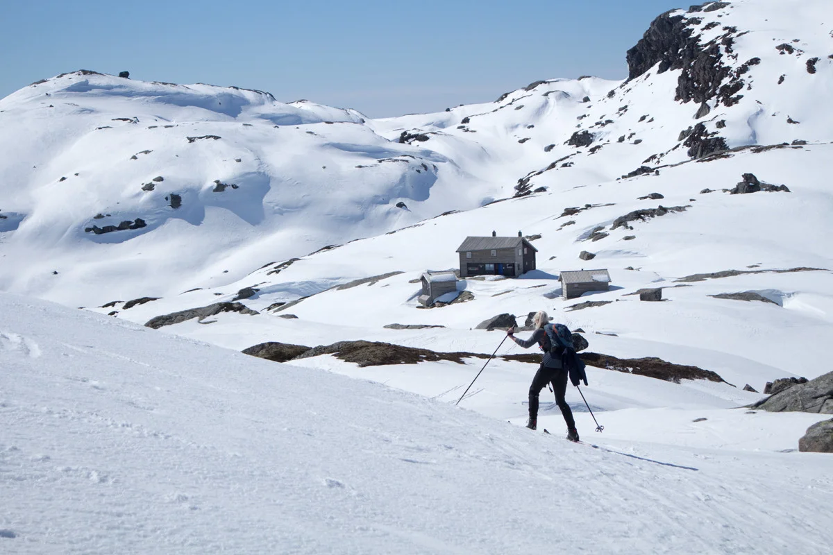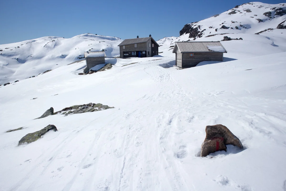 Etter du har krysset vannet går du forbi den store steinen opp bakken til det flater ut. Følg deretter ryggen mot sør-vest. Det er svak stigning og deretter nedrenning til hytten.