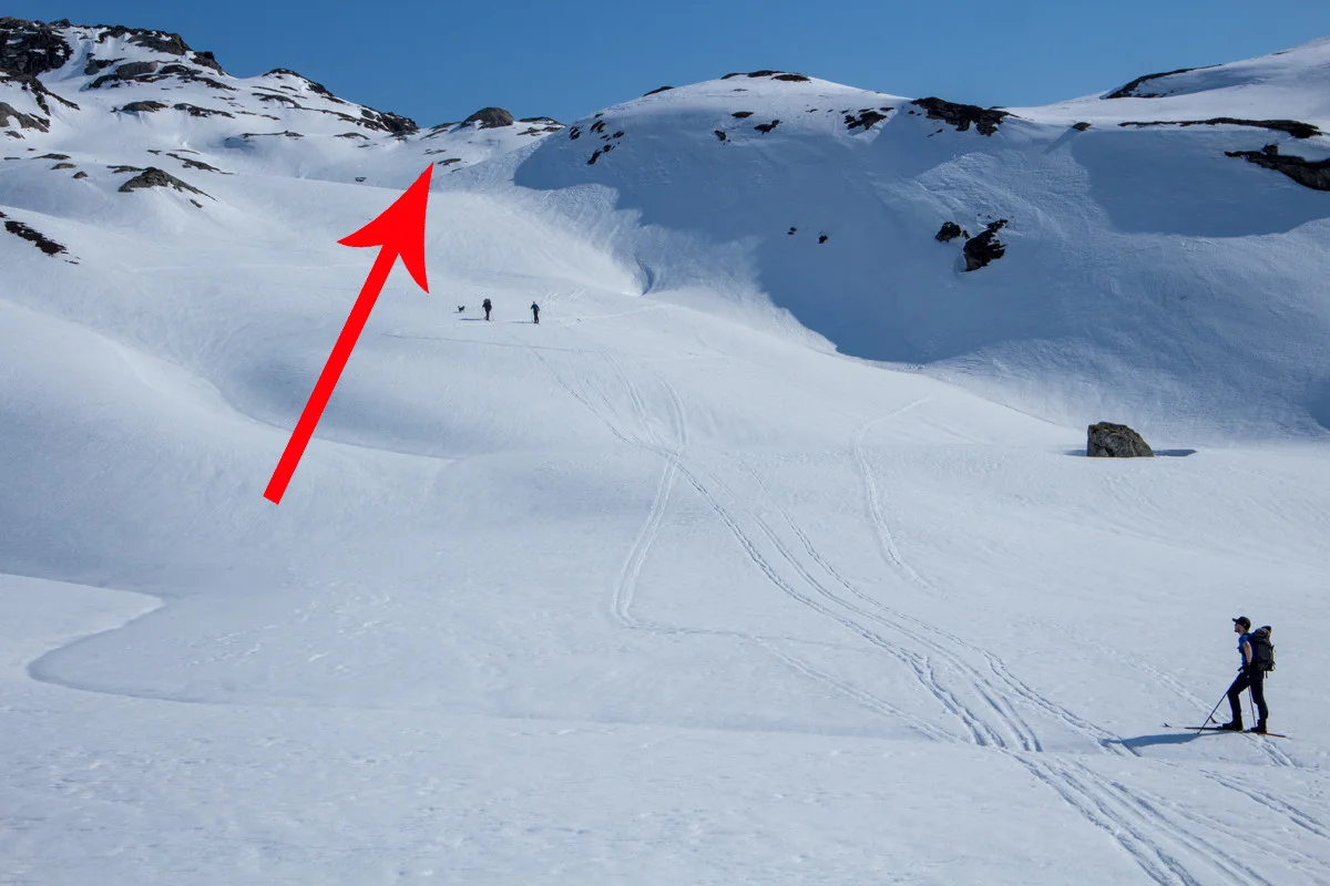 Fortsett videre østover og deretter mot nord-øst. Gå opp den bratten bakken og kryss gjennom den lille fjelldalen til du ser en stor stein. Herfra kan du se ned til Gullhorgabu.