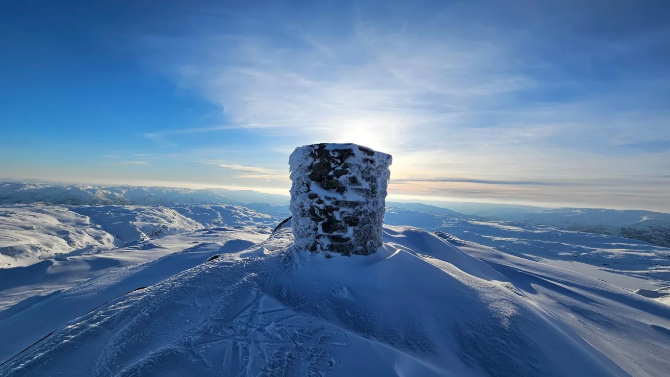 På toppen står en fin og stor varde. Utsikten er helt fantastisk, og du ser flere isbreer i forskjellige retninger.