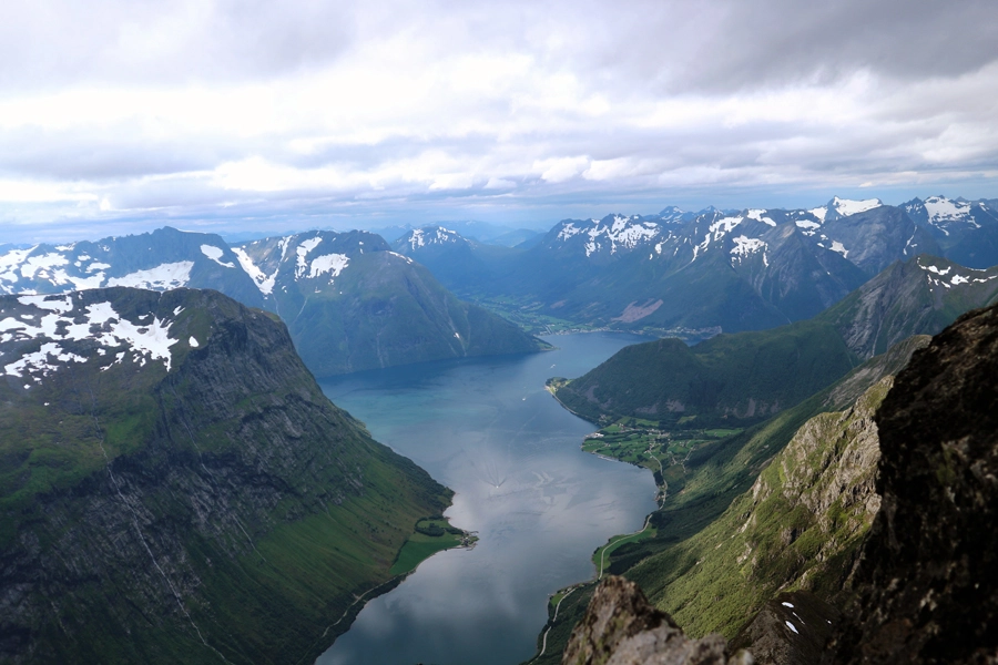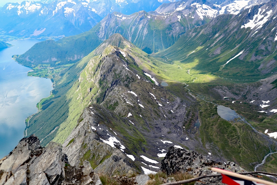 På toppen får du fin utsikt over Hjørundfjorden som kan ta pusen fra de fleste. Platået er ikke særlig stort så det er begrenset med plass.
