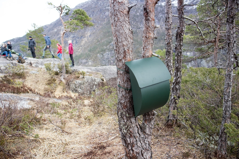 På toppen er det postkasse, liten minvarde og en imponerende utsikt over Romarheimsfjorden i begge retninger. Har du høydeskrekk bør du ikke gå for langt utpå kanten. Returner samme vei.