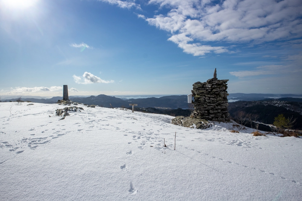 På toppen (458 moh.) er det varde med postkasse og bok. Du får flott utsikt mot Livarden, Hausdalshorga og Gullfjellet i Nord. Møsnuken og Fanafjellet i sør. I Bakgrunnen kan du skimte Folgefonna i øst og havet ut mot vest.