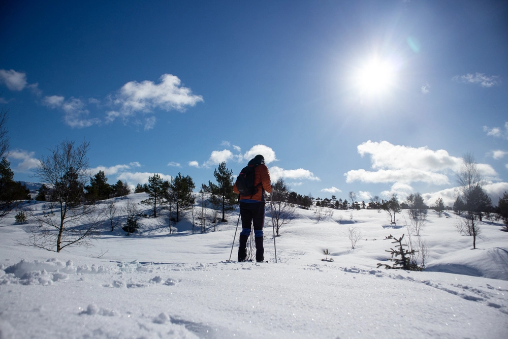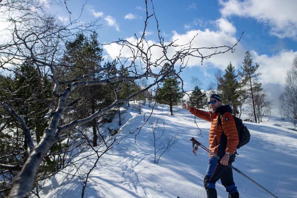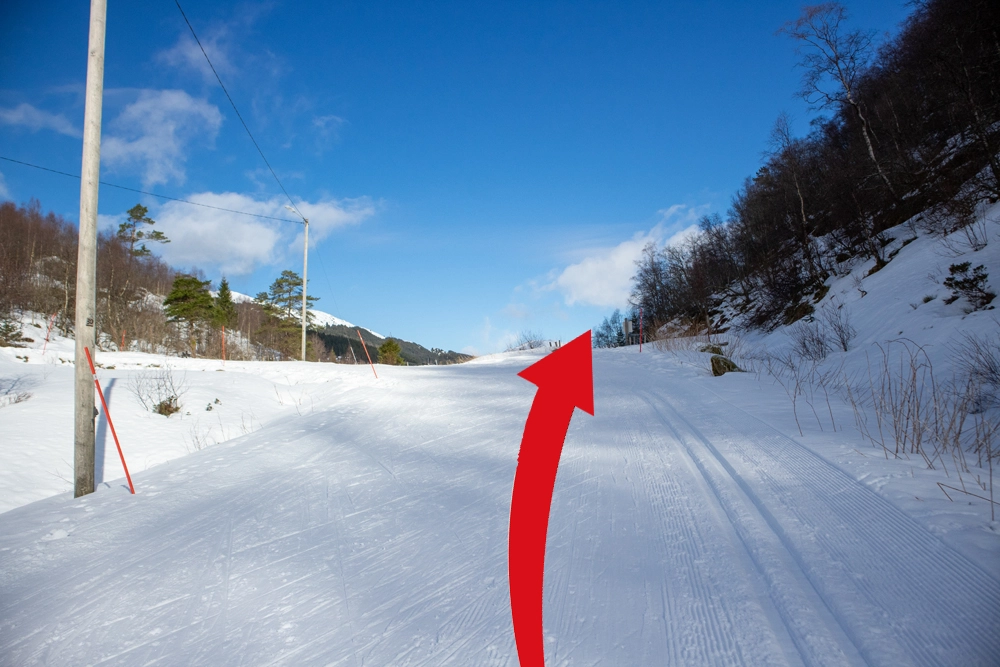 Følg stien gjennom skogen. Her er det bratt så spenn av skiene. Det kan også være isete partier så pass på. Når du kommer gjennom skogen blir terrenget mer åpent og det stigningen blir jevnere. Spenn på skiene og følg ryggen mot sørøst og deretter sørover. Det henger gule merker i trærne som viser vei. Man følger stort sett samme trase som vandreruten.