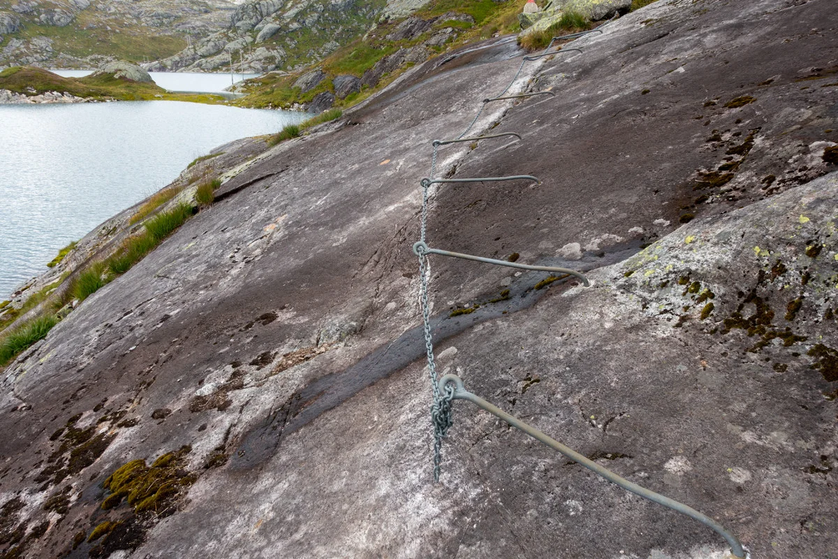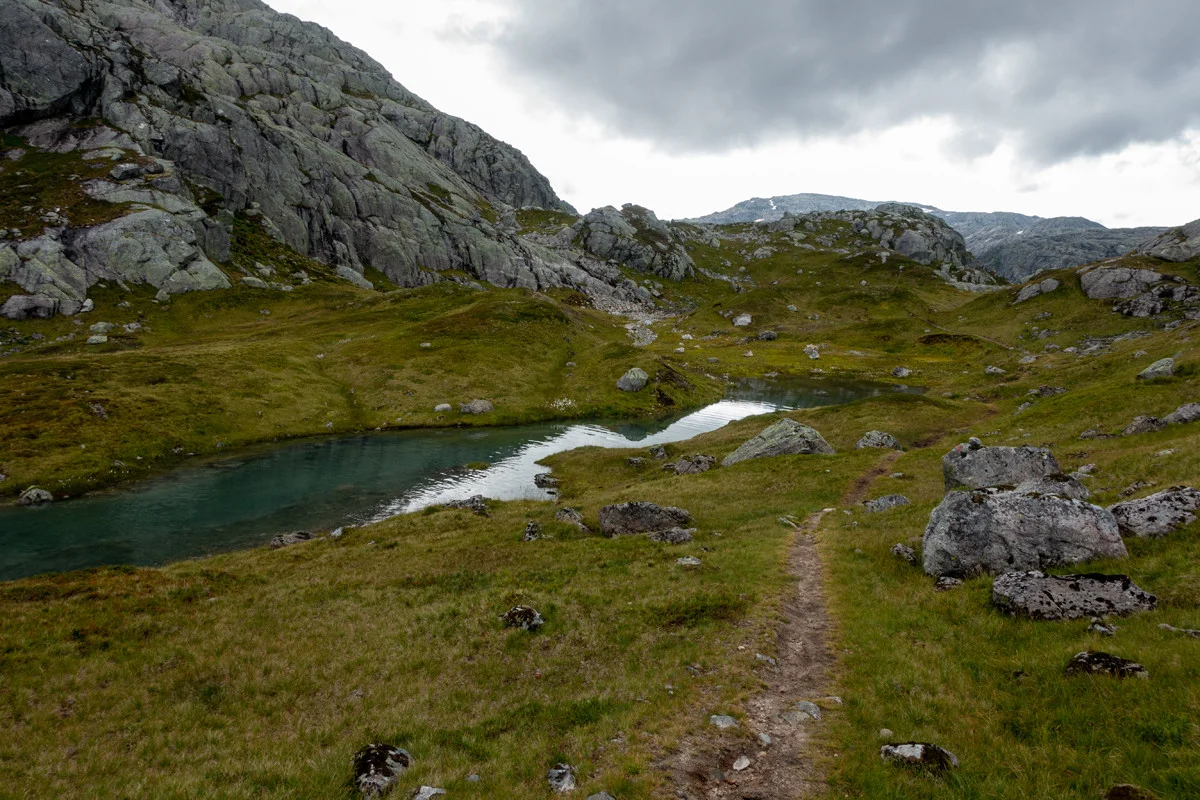 Etter demningen må du oppe en bratt kneik og deretter ned igjen. Turen går i kupert fjellterreng. Det kan minne en del om Stølsheimen, der det går både opp og ned.