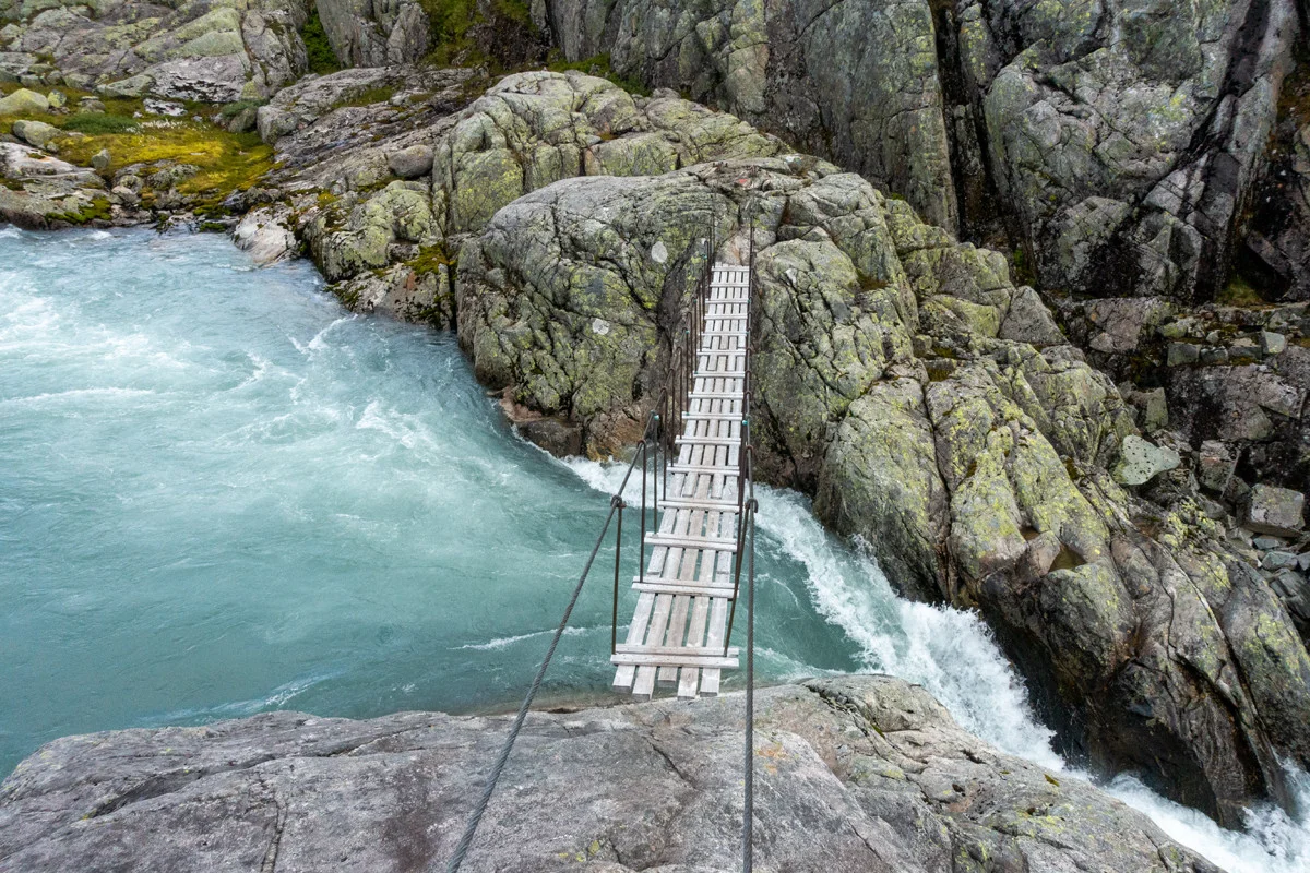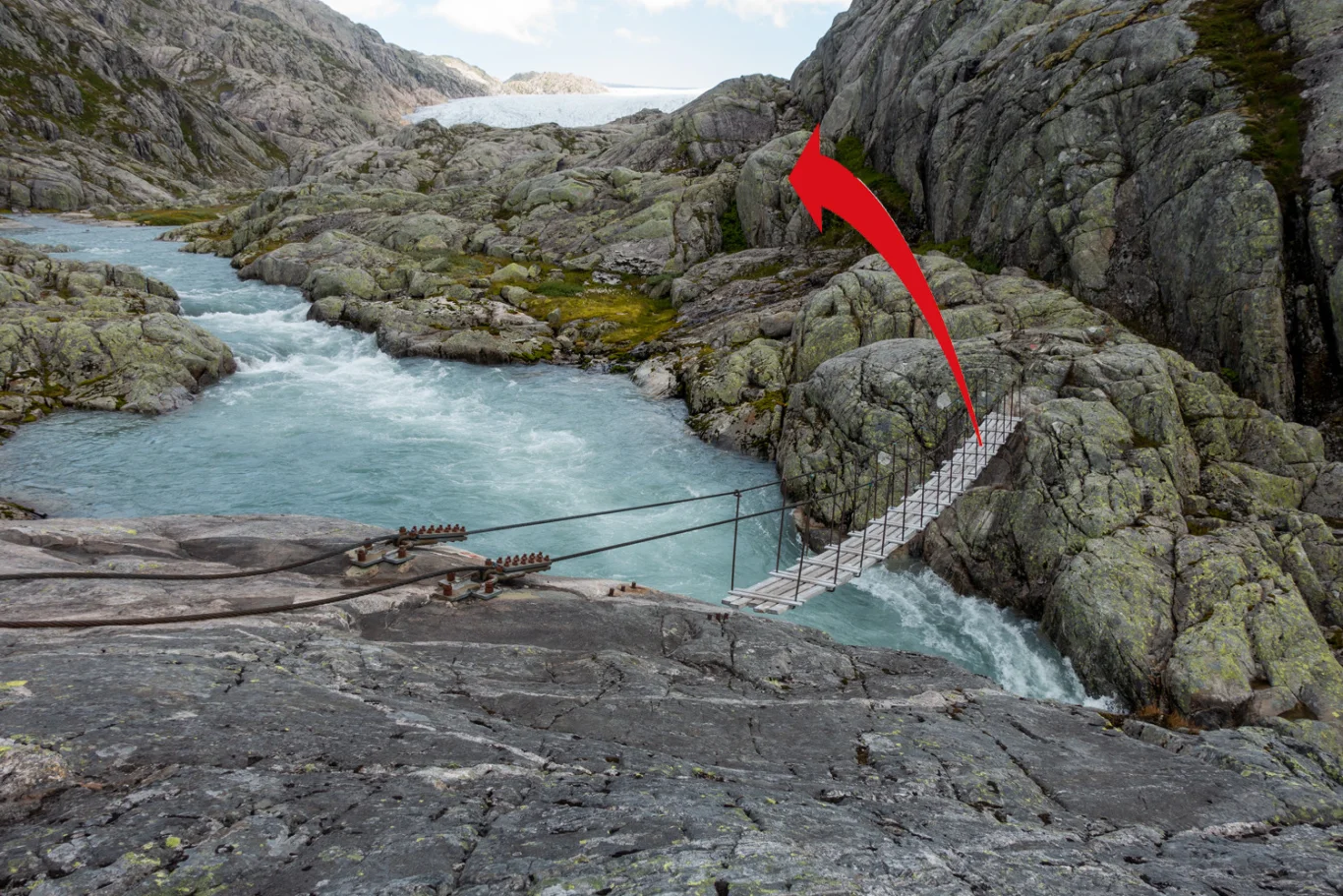 Følg deretter merket sti langs Midtbotnavatnet og deretter østover. Nå kommer du til dalen hvor du kan se Svelgabreen. Her er en Sikringshytte med to sengeplasser. Følg stien videre mot nord-øst og kryss broen. Vær forsiktig da denne broen er eksponert. Følg deretter stien videre frem til brearmen.