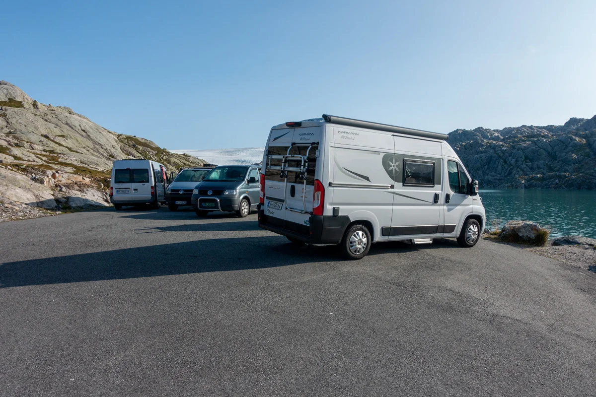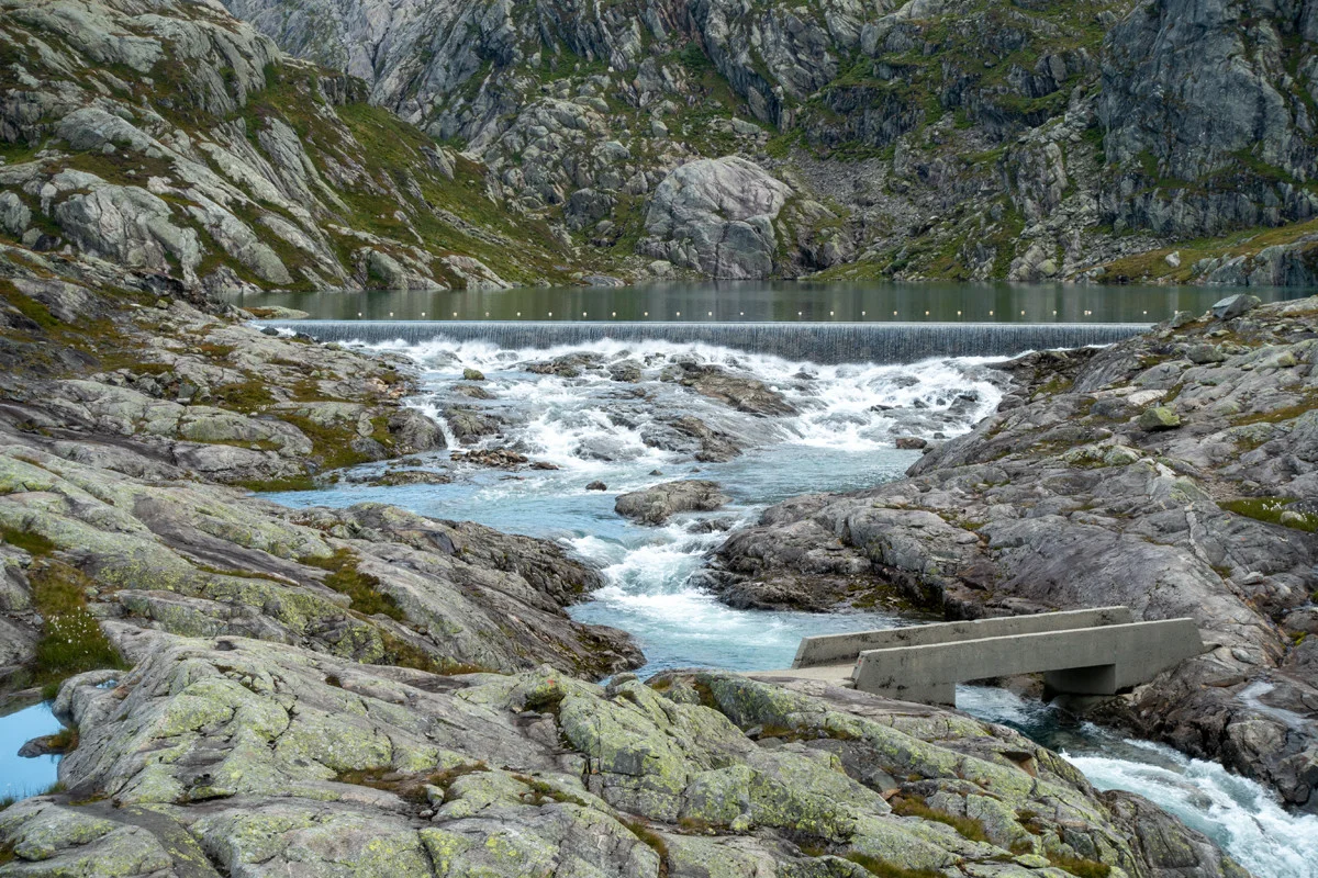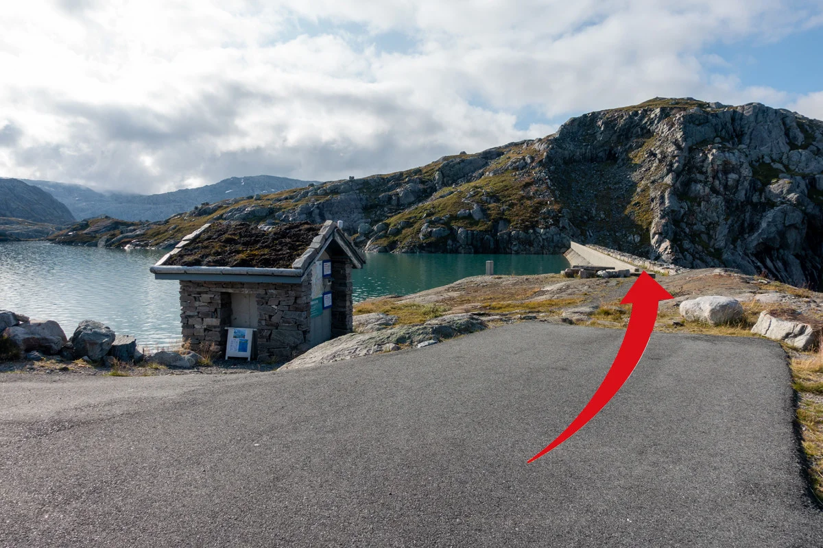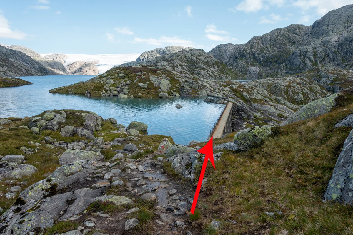 Fra parkeringen er det merket sti frem til Svelgabreen. Gå til enden av parkeringen og kryss demningen.