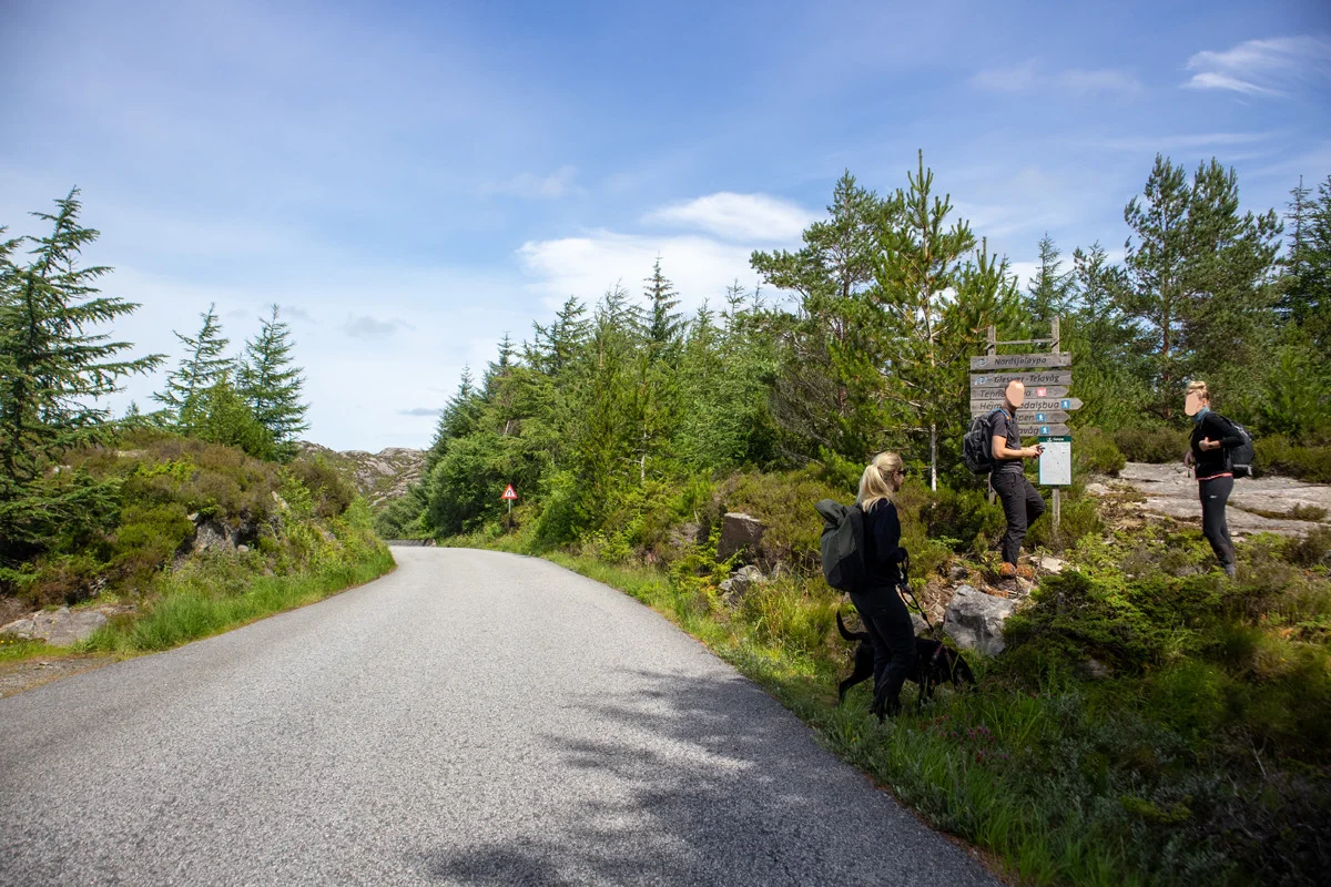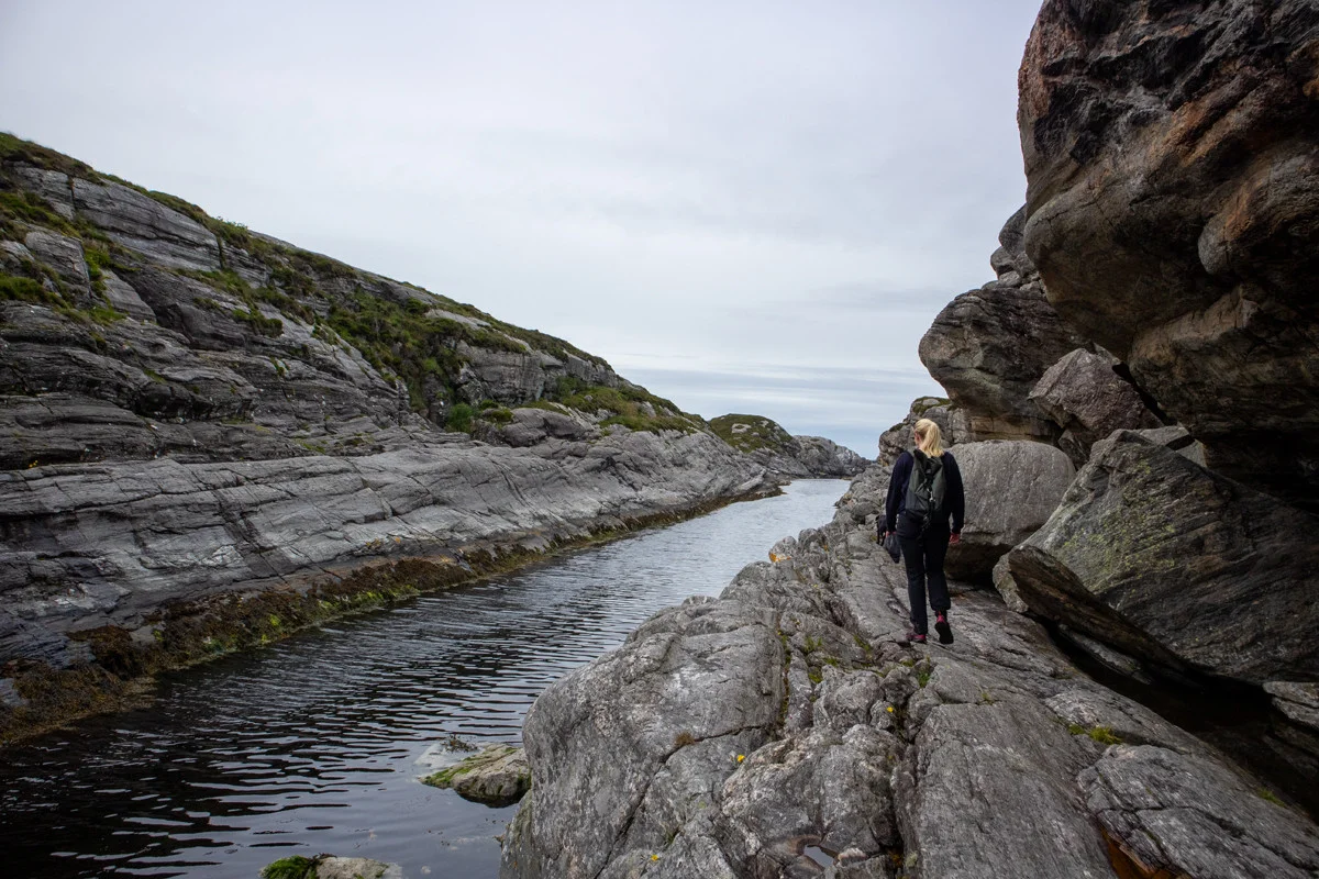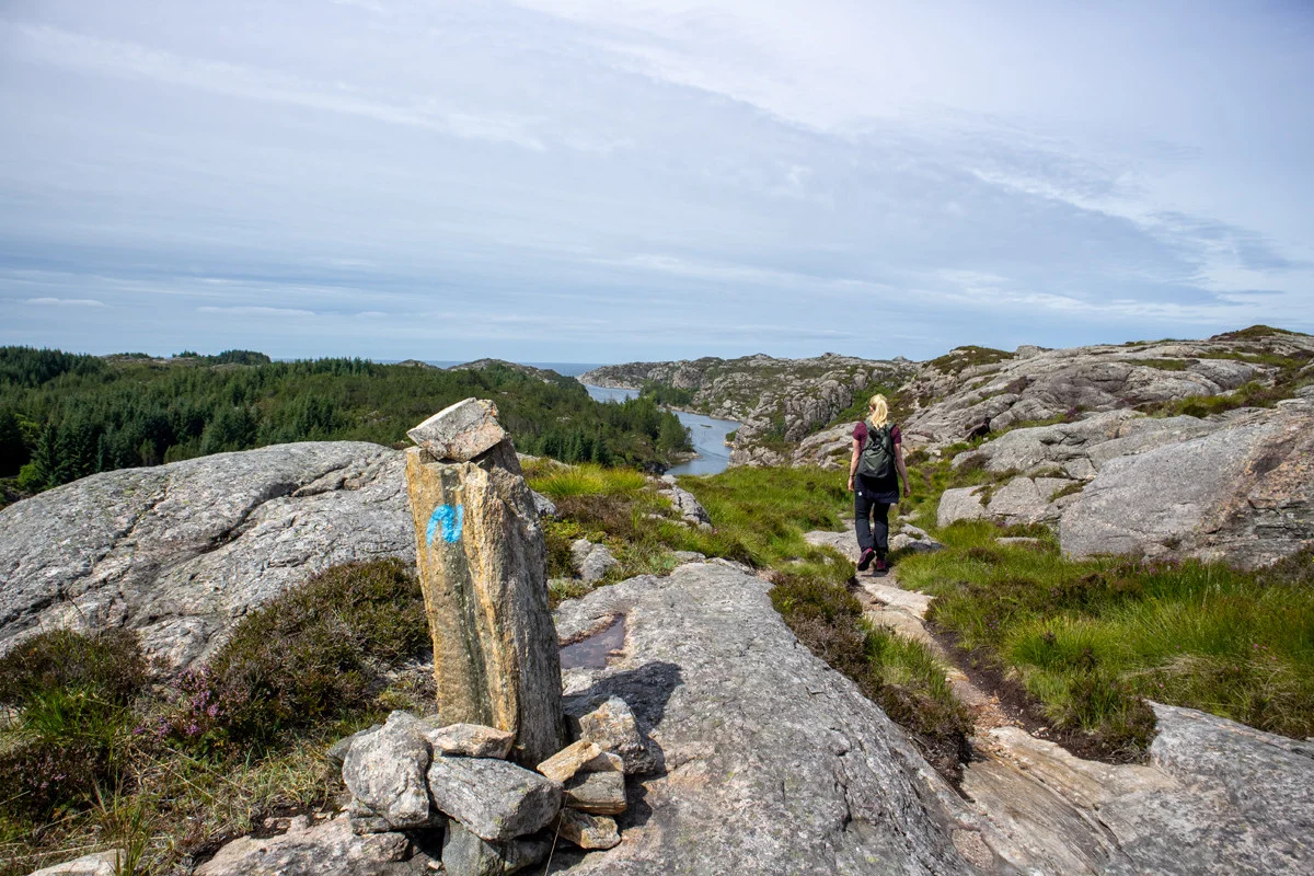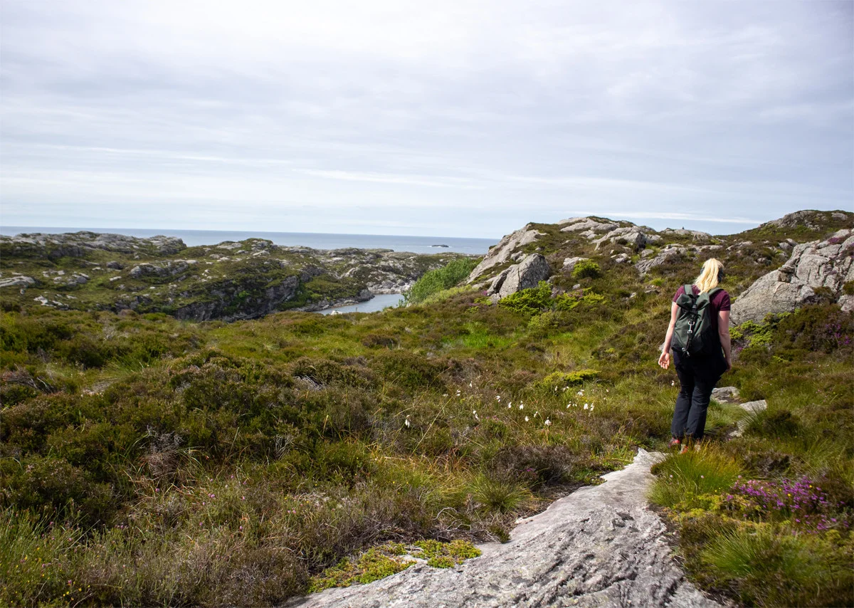 Herfra skal du følge stien nordover. Terrenget er klassisk Sotra. Ingen vegetasjon, mye stein, stup og mye vind.