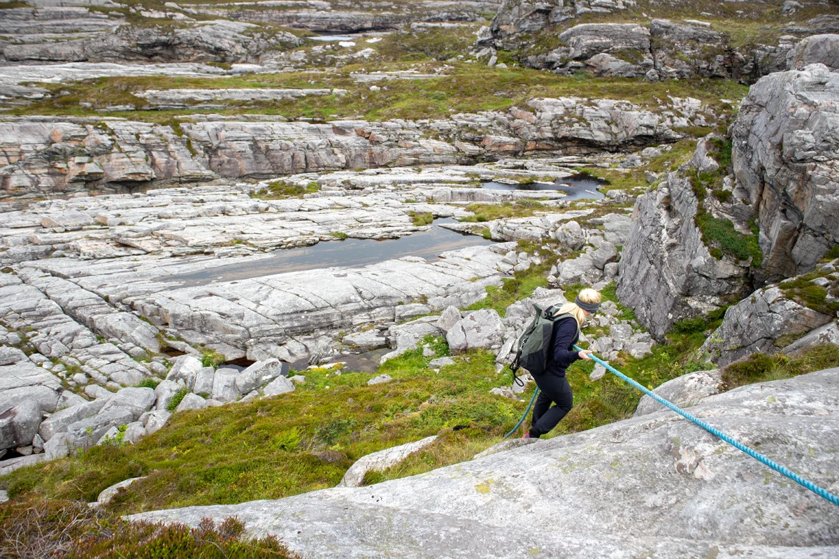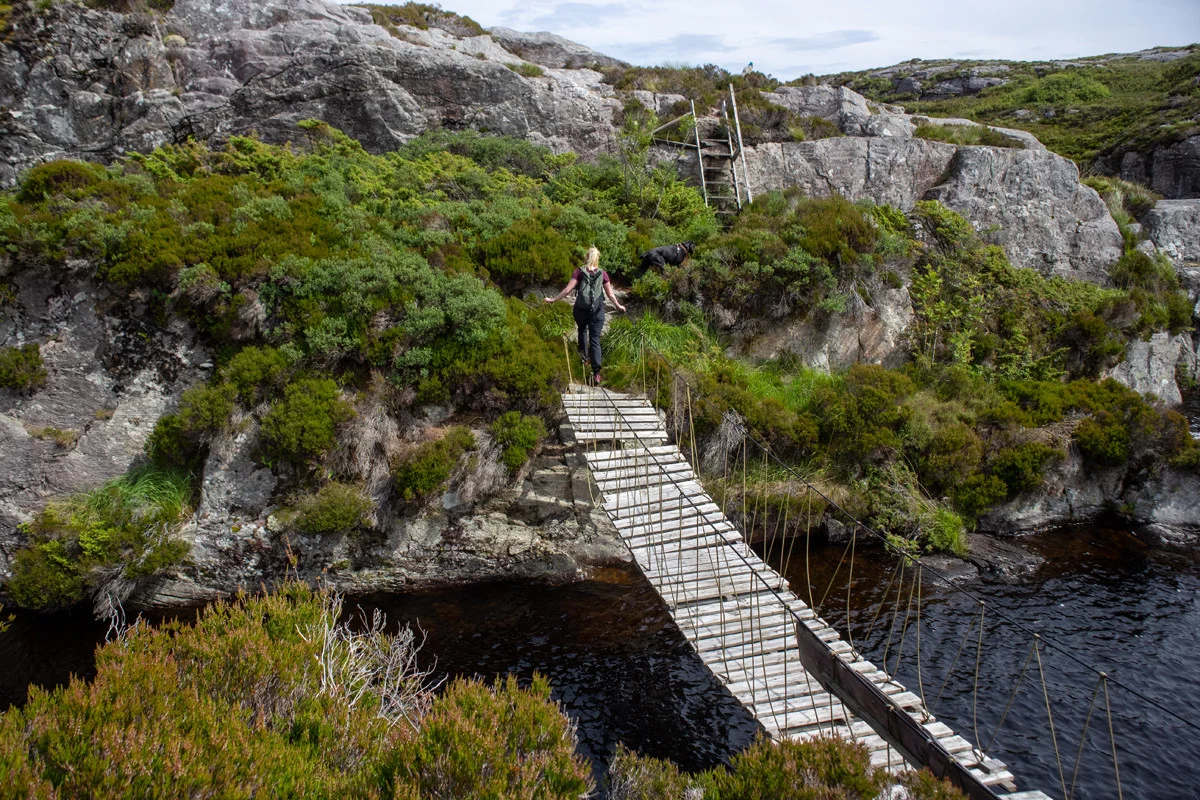 Denne delen av turen er også veldig spennende. Du må klatre ned et tau, gå gjennom en dyp ravine og over en hengebro. Siste del av rundturen etter hengebroen er den letteste. Her går det jevnt opp og ned. Legg merke til de gamle telefonstolpene langs stien. Det står et stort skilt som forteller historie. Følg deretter merket sti tilbake mot sti krysset hvor du i starten gikk til venstre mot Goltasundet. Fra sti krysset går du samme vei tilbake til bilen hvor du kom fra.