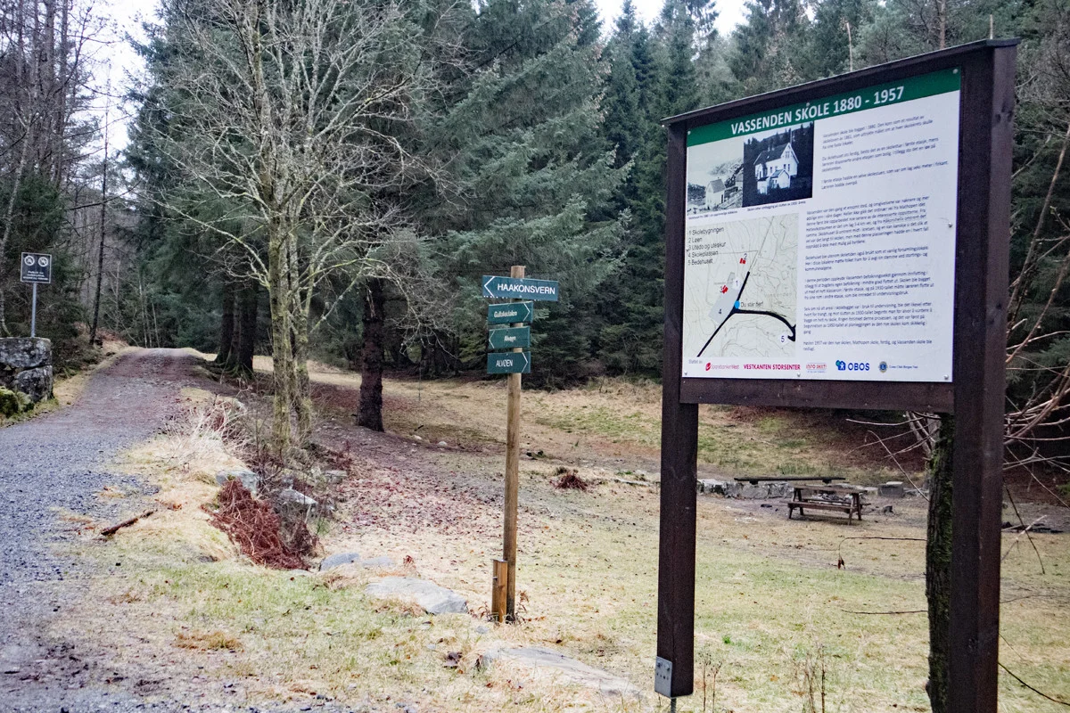 Fra parkeringen følger du Alvøveien nordover og deretter til høyre inn til idrettsanlegget. Følg asfaltert vei langs fotballbanene og deretter videre på grusvei. I bunnen av bakken er det beite med sauer, benker og en flott skulptur. Følg grusveien rundt svingen gå til høyre skiltet "Gullaksdalen". Viderer følger du grusveien ned til vannet hvor det er en hytte. Herfra går du videre på sti skiltet "Vassenden". Stien leder opp til demningen ved Storevatnet. Følg stien på høyre side av vannet over broen.