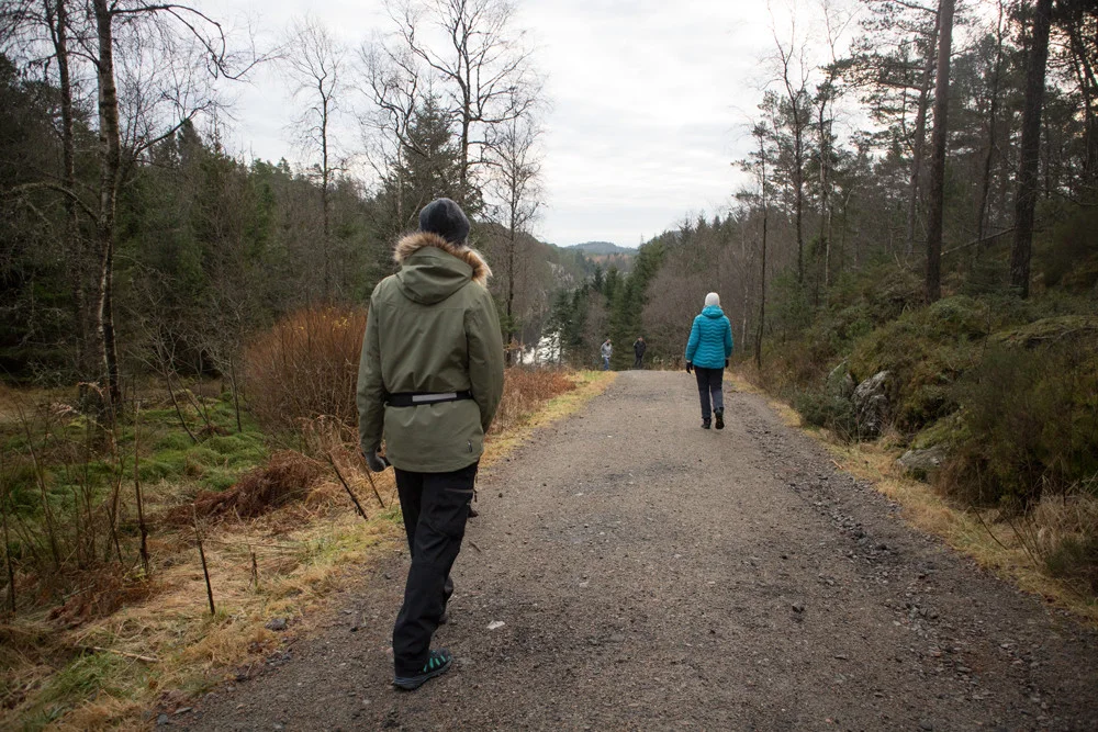 Videre går stien gjennom skogen og over på grusvei. Følg grusveien ned til Småvatnet å gå videre på høyre side. Veien fører deg ned til hovedveien. Gå langs hovedveien tilbake til turparkeringen. Mot slutten anbefales å ta en avstikker over demningen i Alvøen.