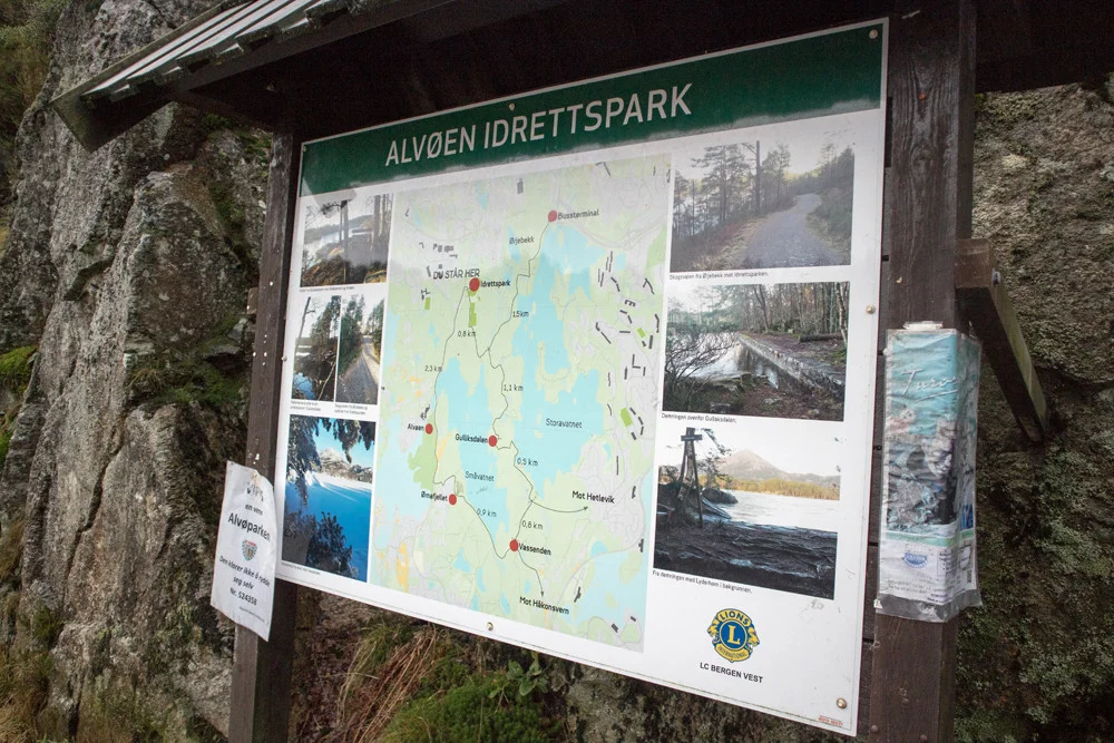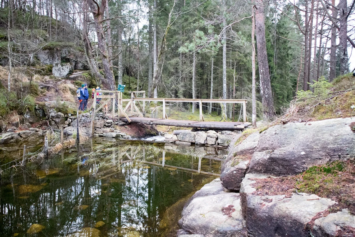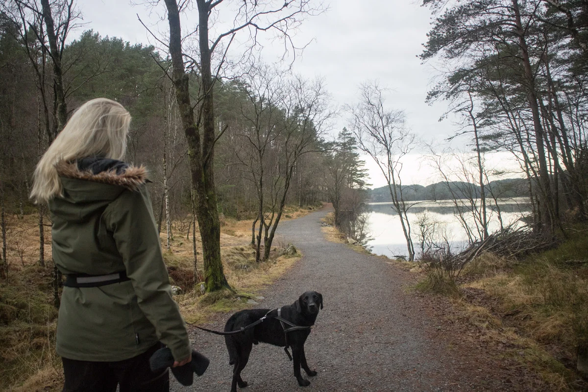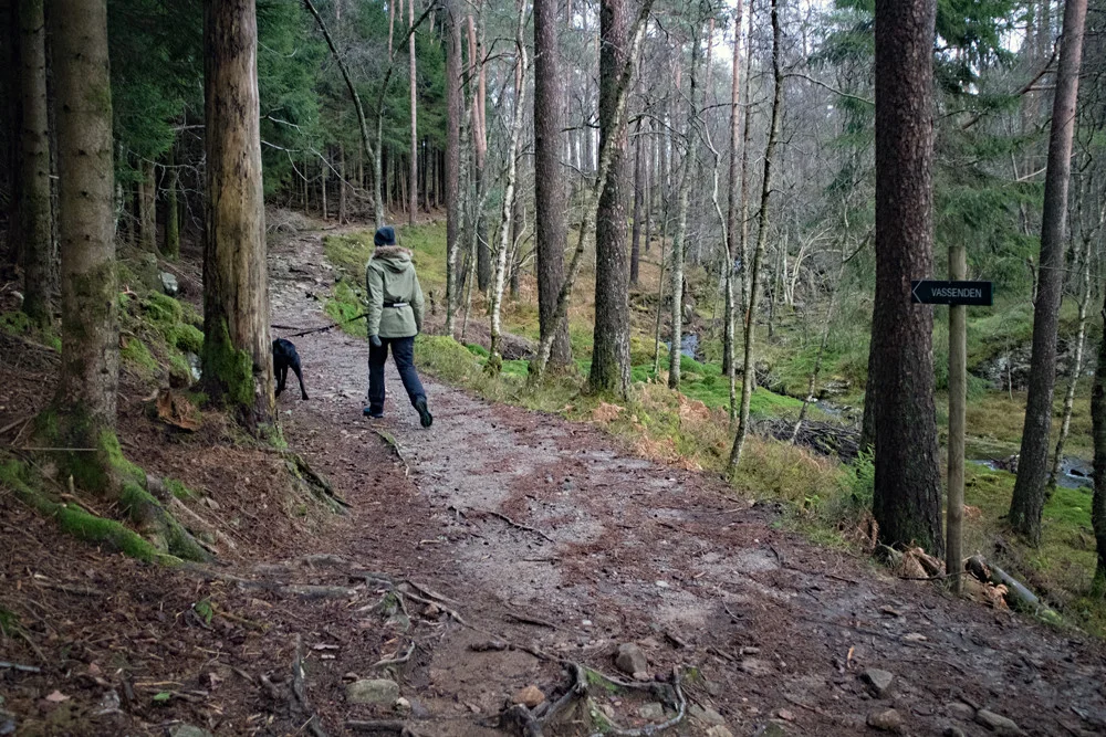 Det er mange turmuligheter i Alvøskogen. Det går stier på kryss og tvers og det er også lysløype. Vi valgte å gå rundt Småvatnet.