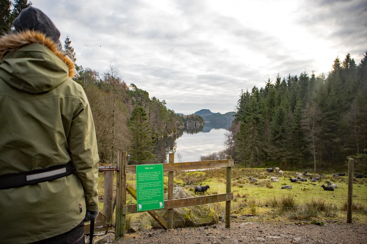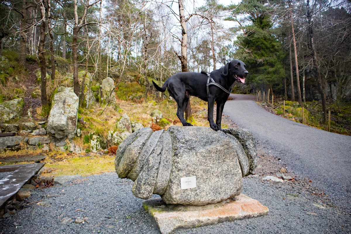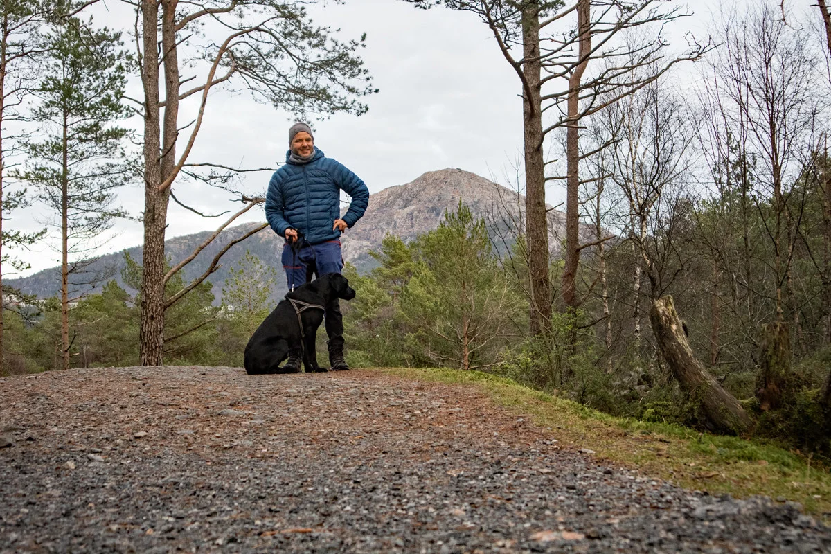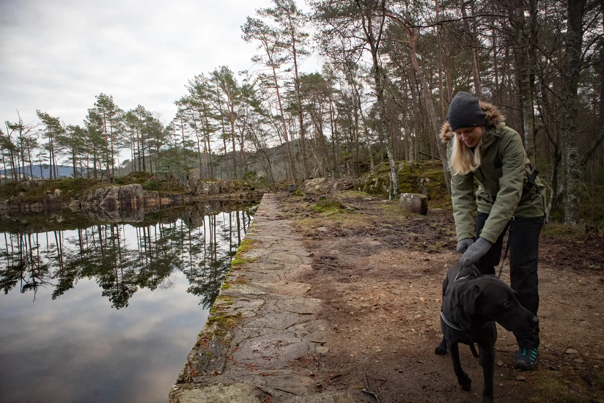 Det er mange turmuligheter i Alvøskogen. Det går stier på kryss og tvers og det er også lysløype. Vi valgte å gå rundt Småvatnet.