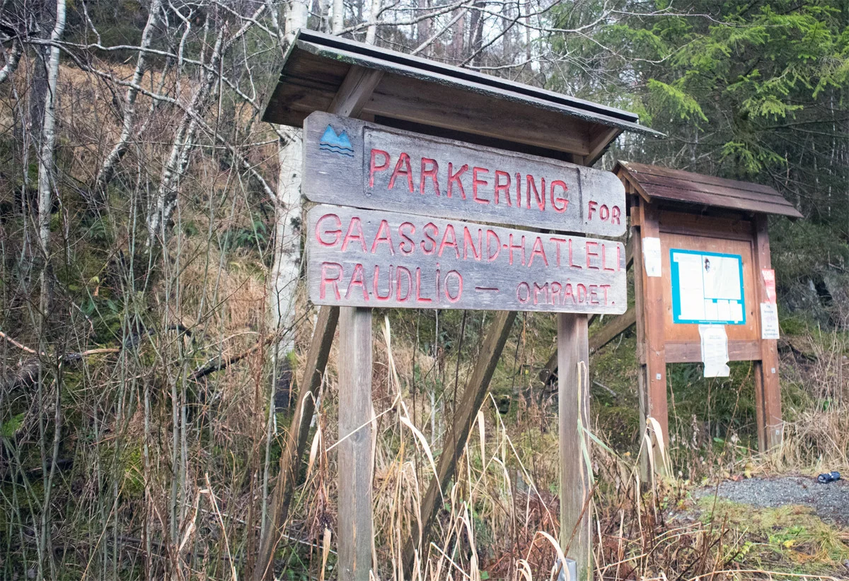 Gå til enden av parkeringsplassen og følg grusveien hvor det er skiltet "Raudlistova 3,9 km."