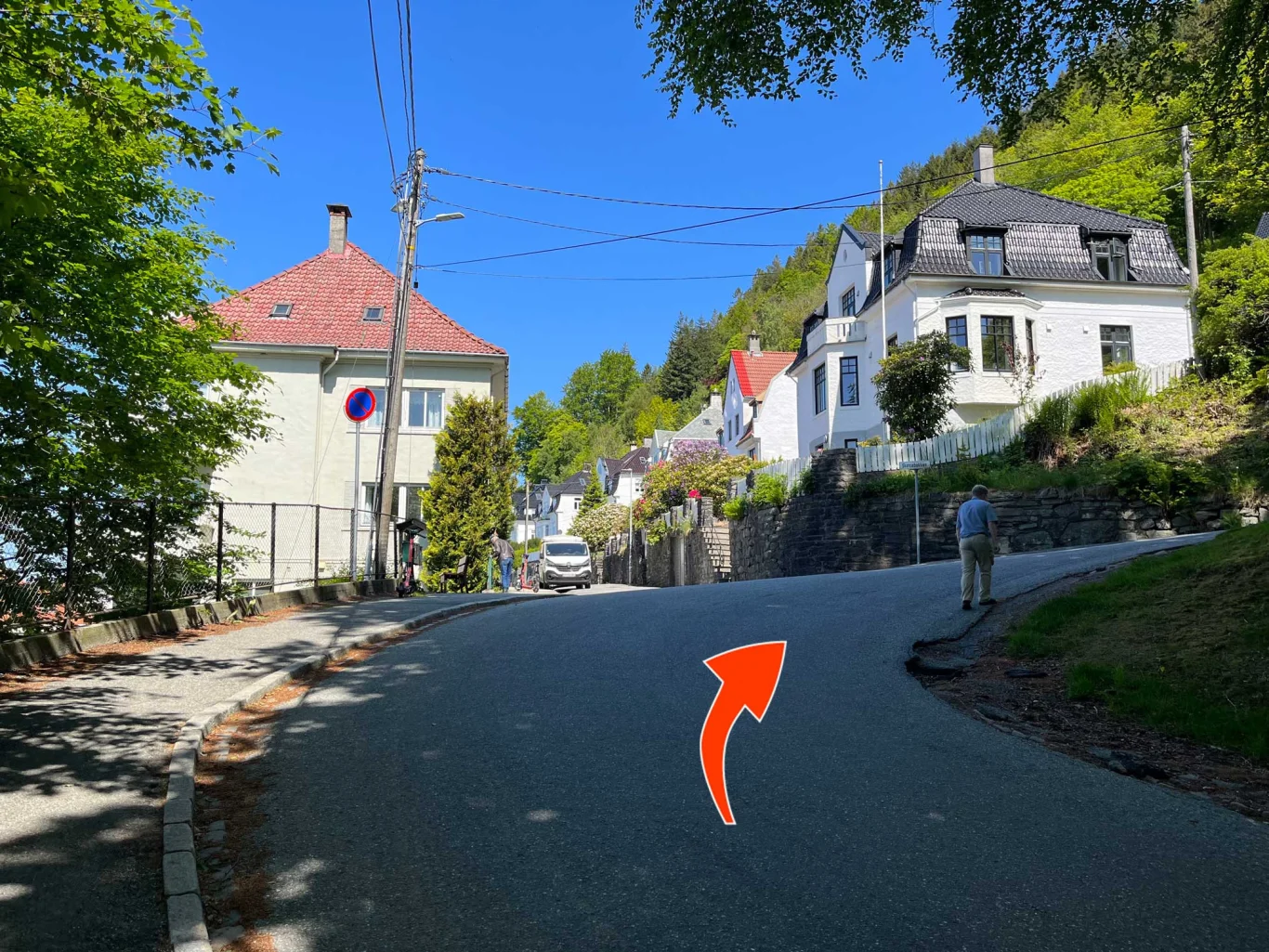 Turen til Fjellhytten på Fløyen starter ved Fløibanens nedre stasjon. Gå opp svingene mot Skansen Brannstasjon og videre langs Skansenbakken.